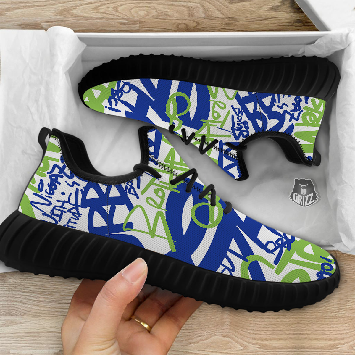 Green Blue Urban Graffiti Text Print Pattern Black Walking Shoes