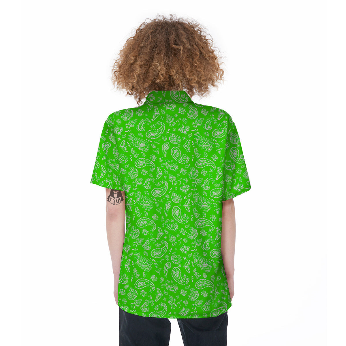 Green Neon Paisley Bandana Print Women's Short Sleeve Shirts