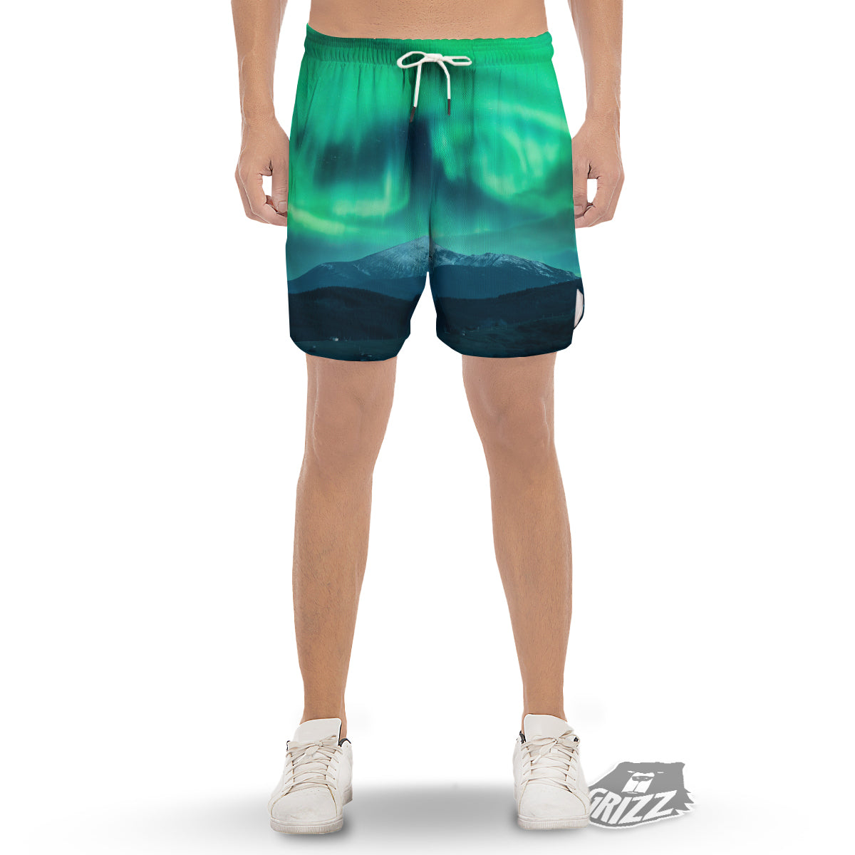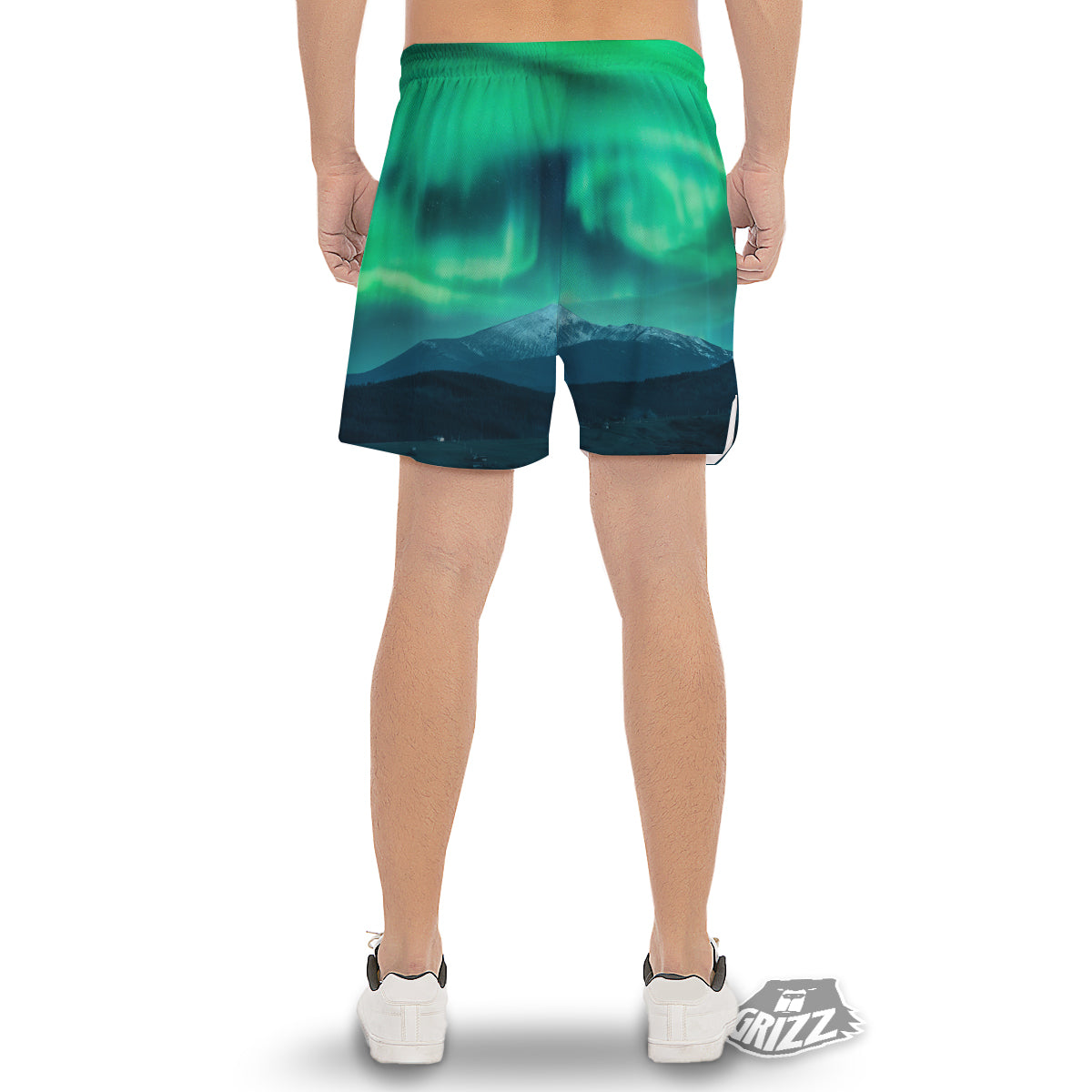Green Northern Lights And Snowy Mountains Print Men's Gym Shorts
