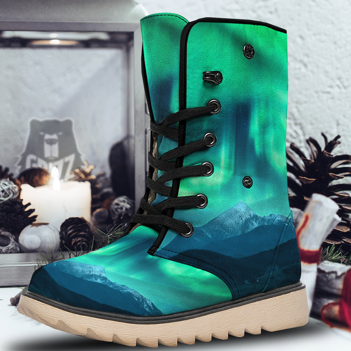Green Northern Lights And Snowy Mountains Print Snow Boots