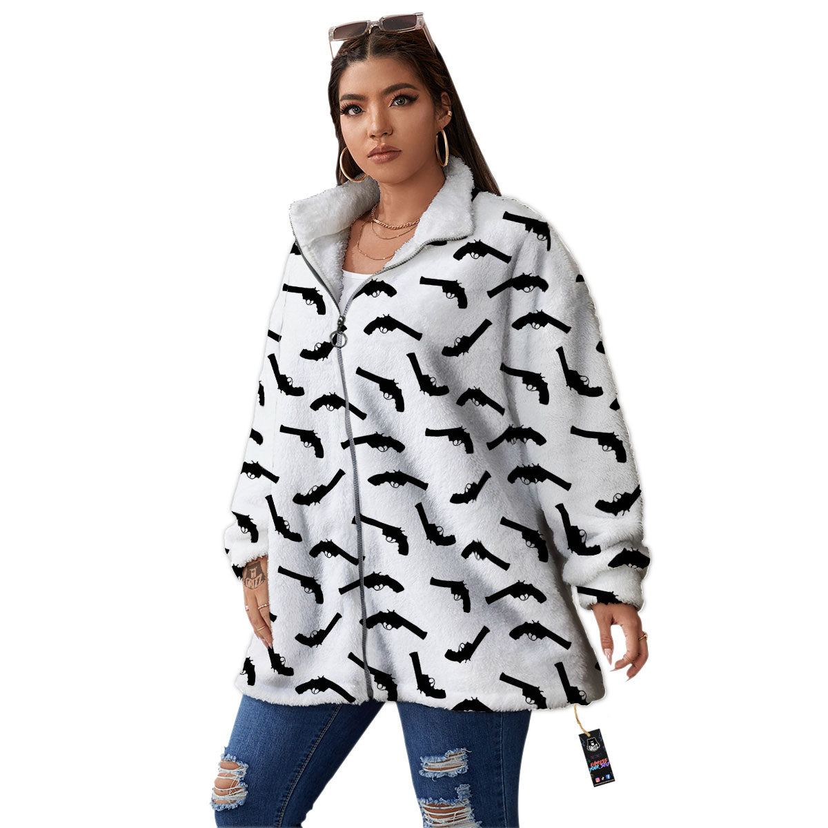 Guns White And Black Print Pattern Women's Sherpa Jacket