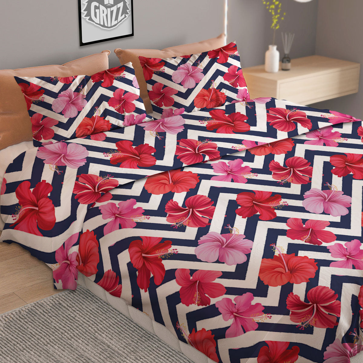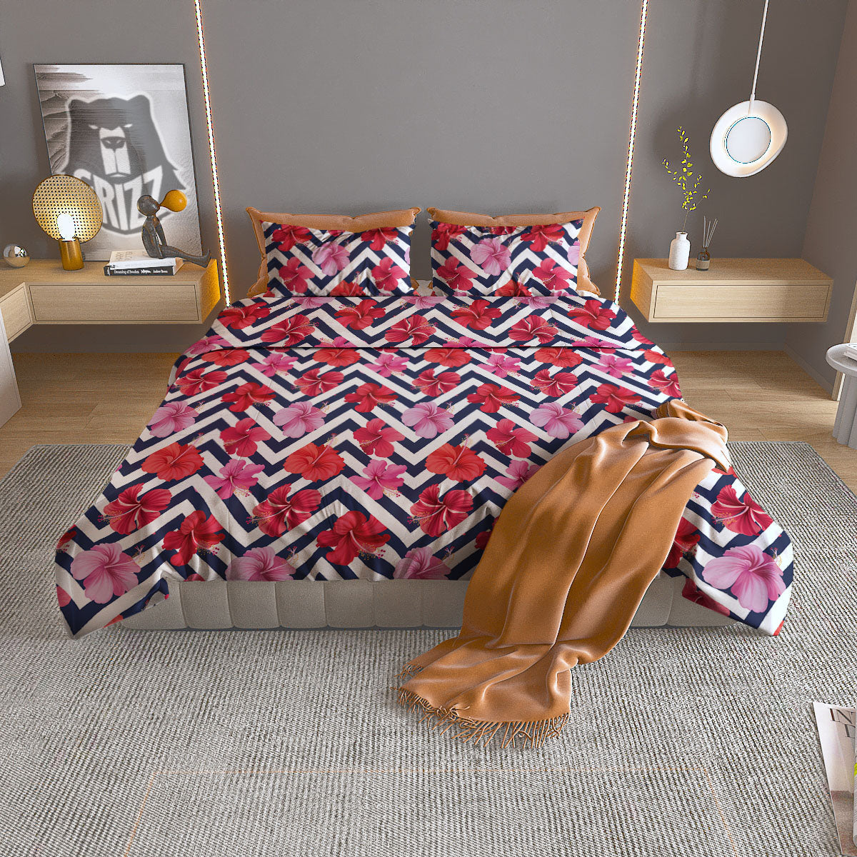 Hibiscus Zigzag Pink Print Pattern Duvet Cover Bedding Set