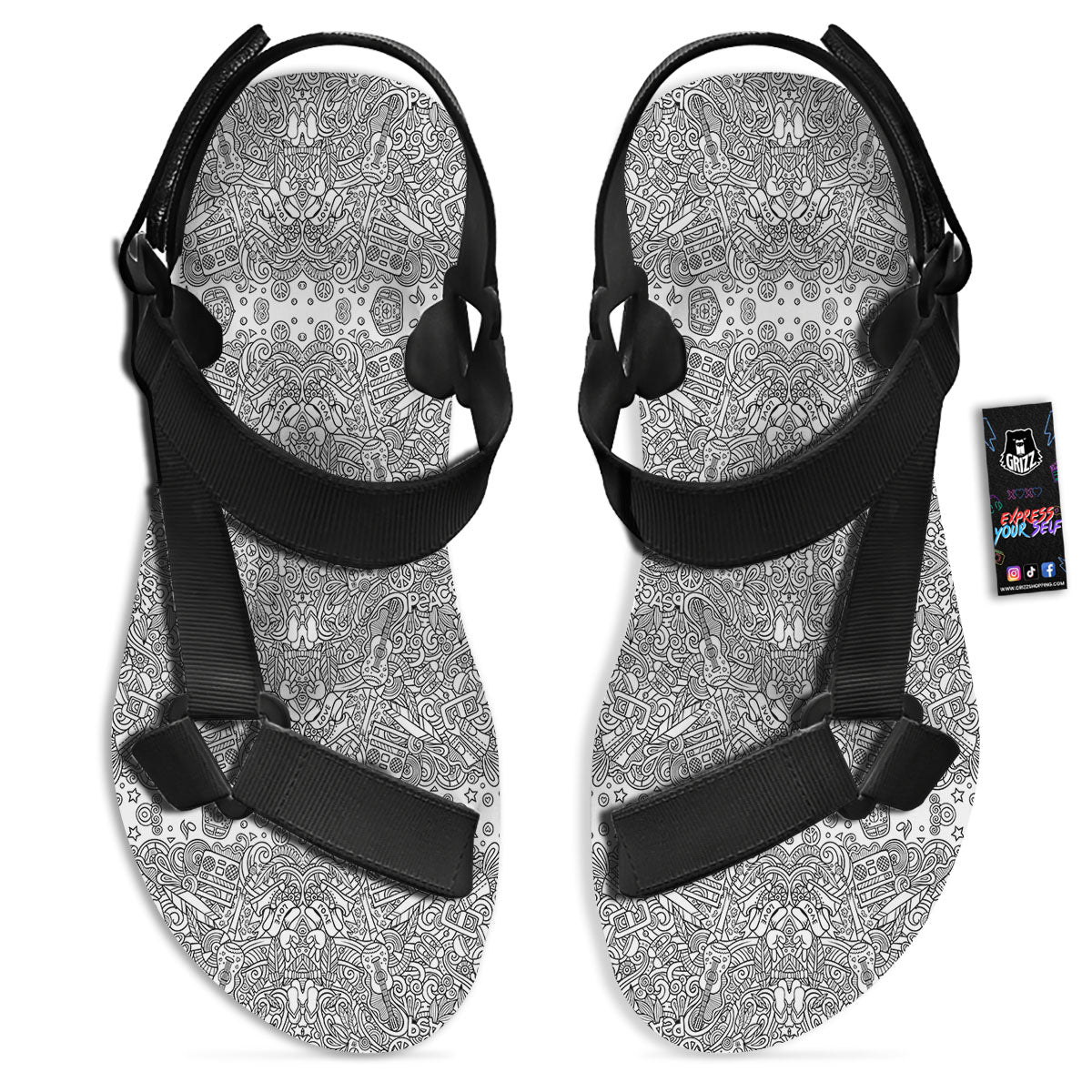 Hippie Graffiti Monochrome Print Pattern Black Open Toe Sandals