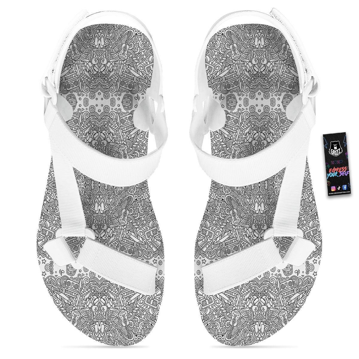 Hippie Graffiti Monochrome Print Pattern White Open Toe Sandals