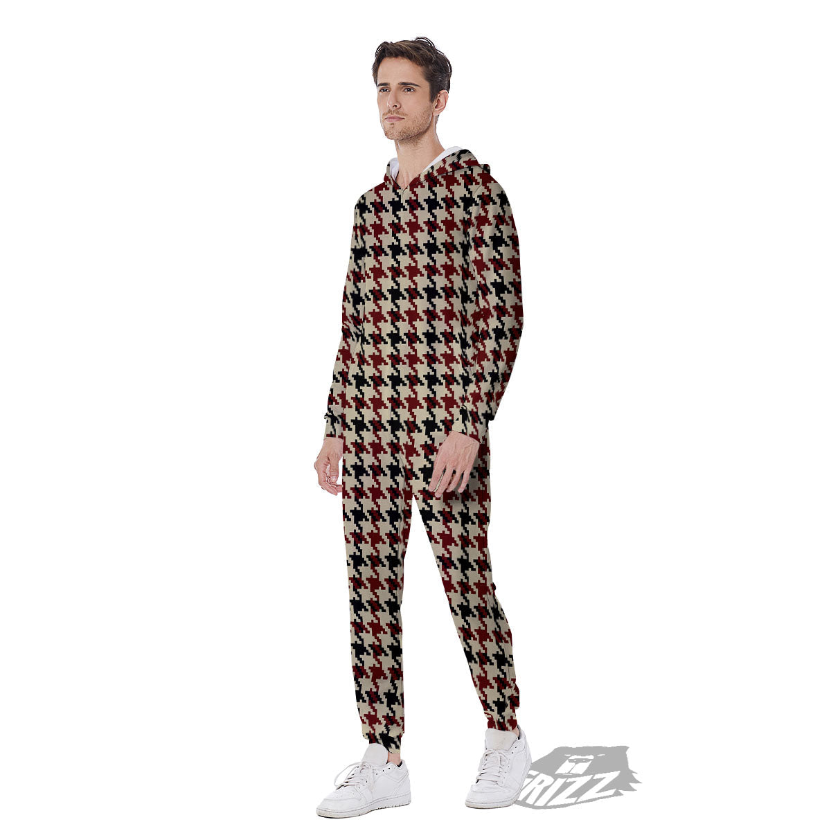 Houndstooth Red Brown Print Pattern Men's Jumpsuit