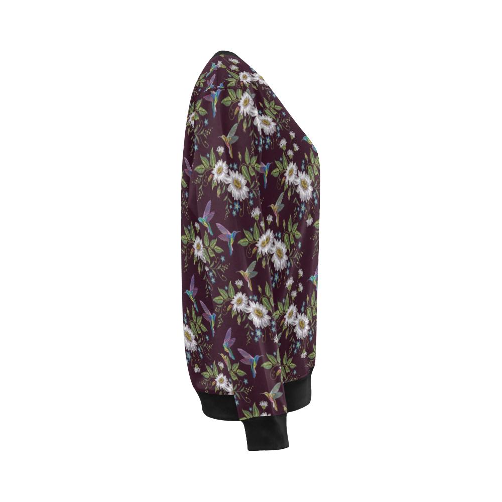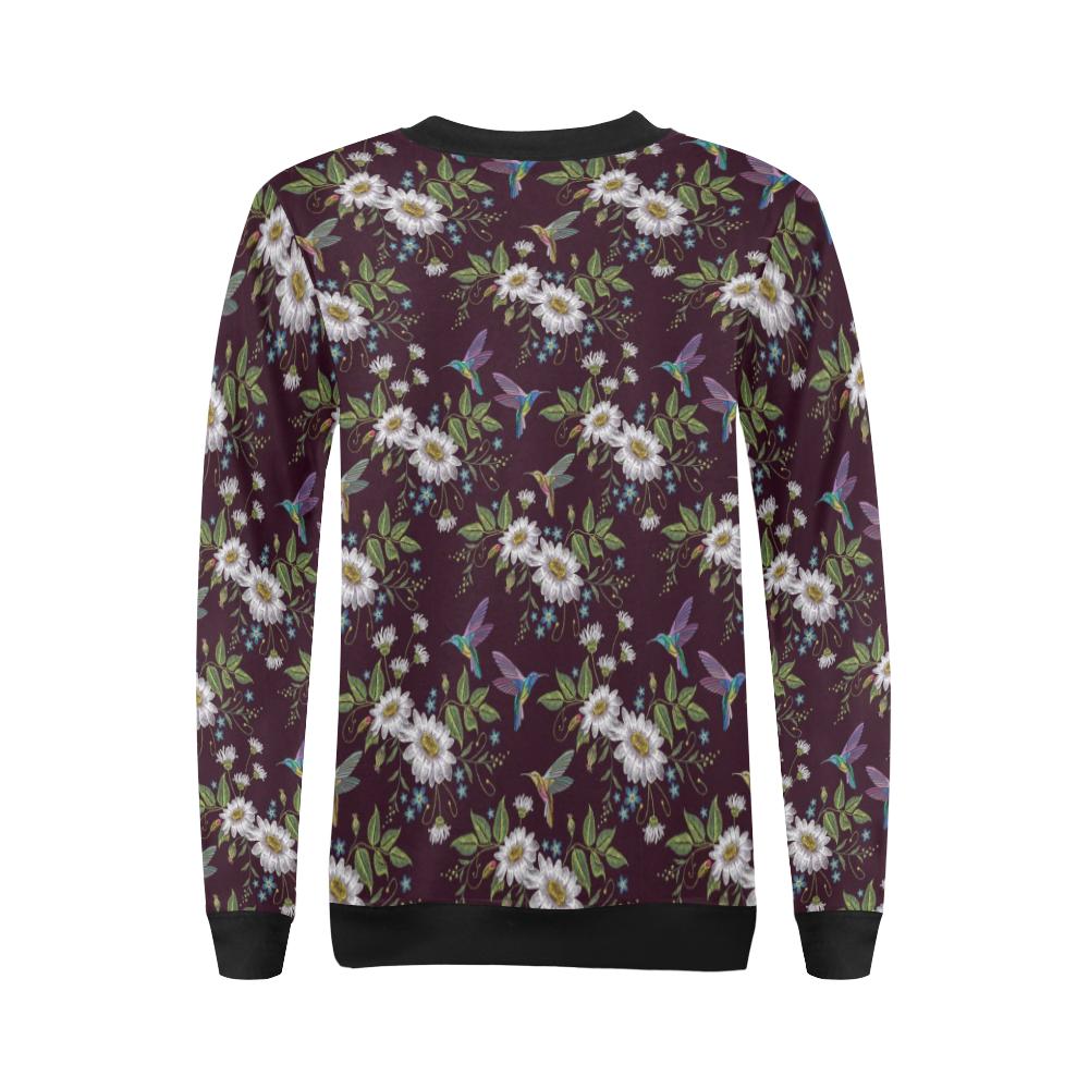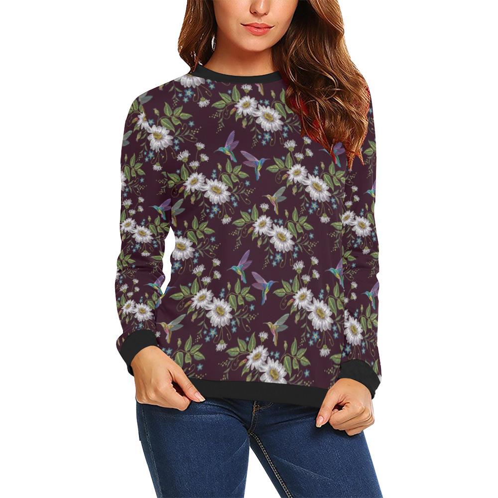 Hummingbird White Daisy Pattern Print Women Crewneck Sweatshirt