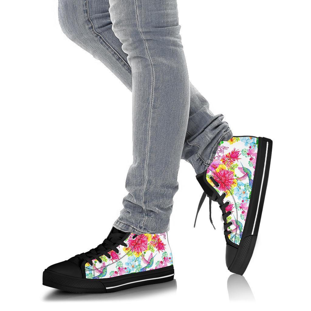 Hummingbird White Floral Drawing Men Women's High Top Shoes