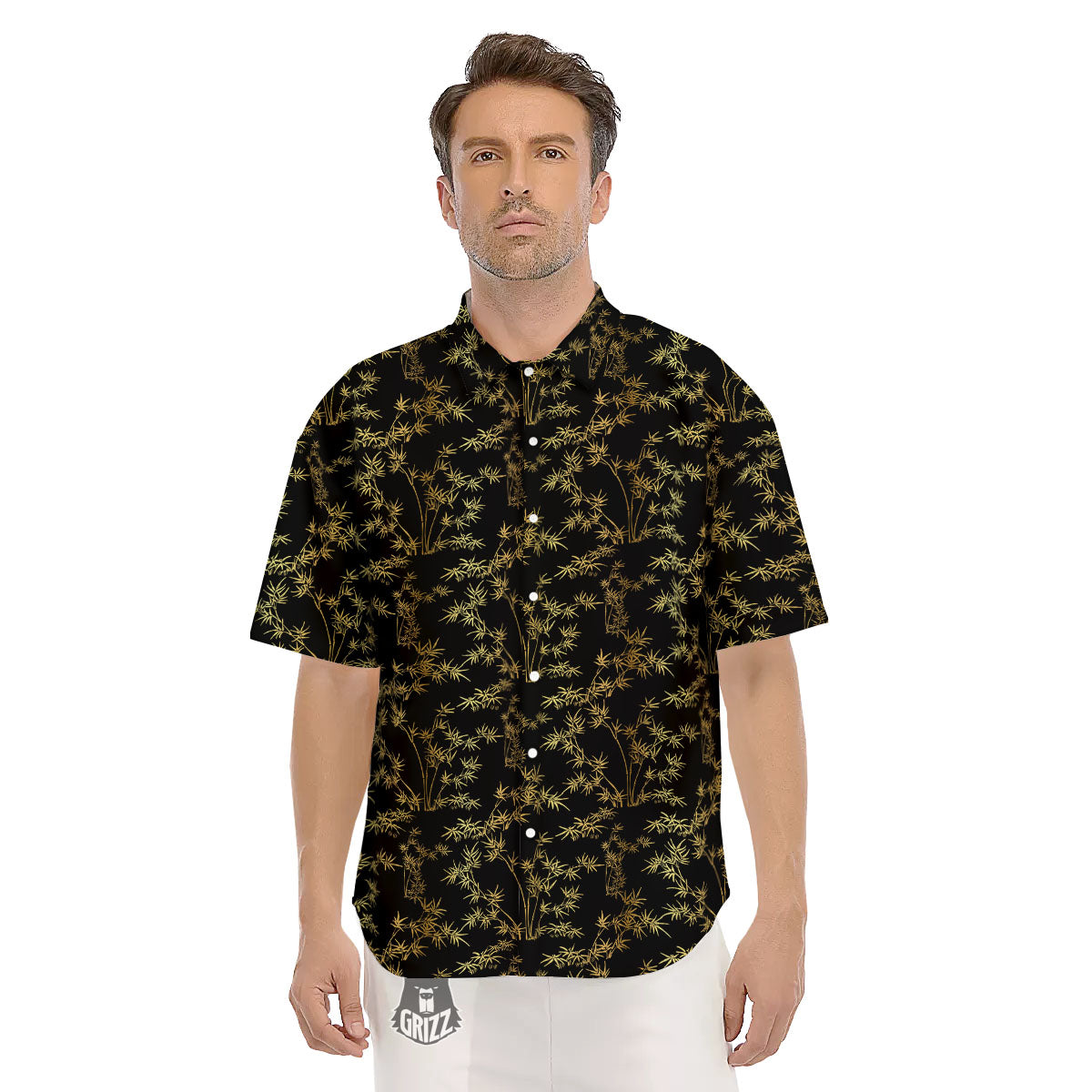 Japanese Bamboo Black And Gold Print Pattern Men's Short Sleeve Shirts