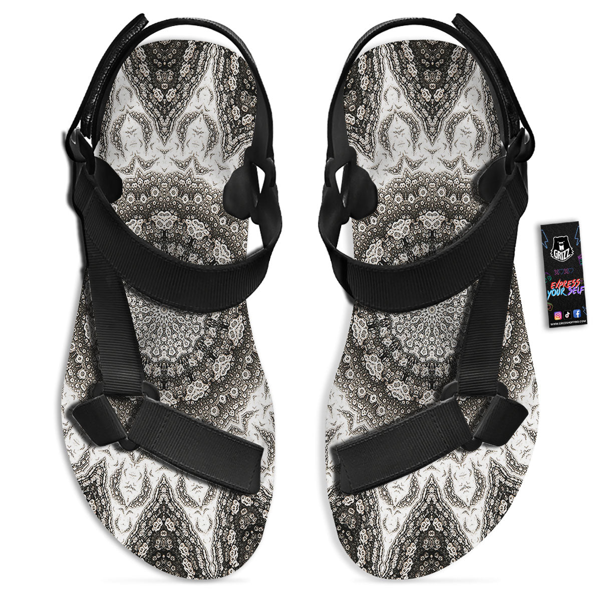 Looking for unique toe sandals? Check out our Kaleidoscope White Print Black Open Toe Sandals at Grizzshopping. Our toe sandals are handcrafted to the highest quality standards that custom made for you