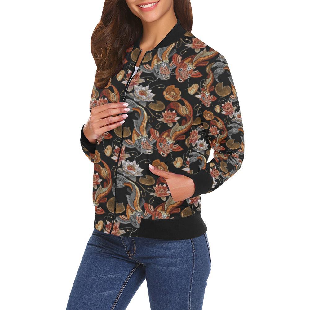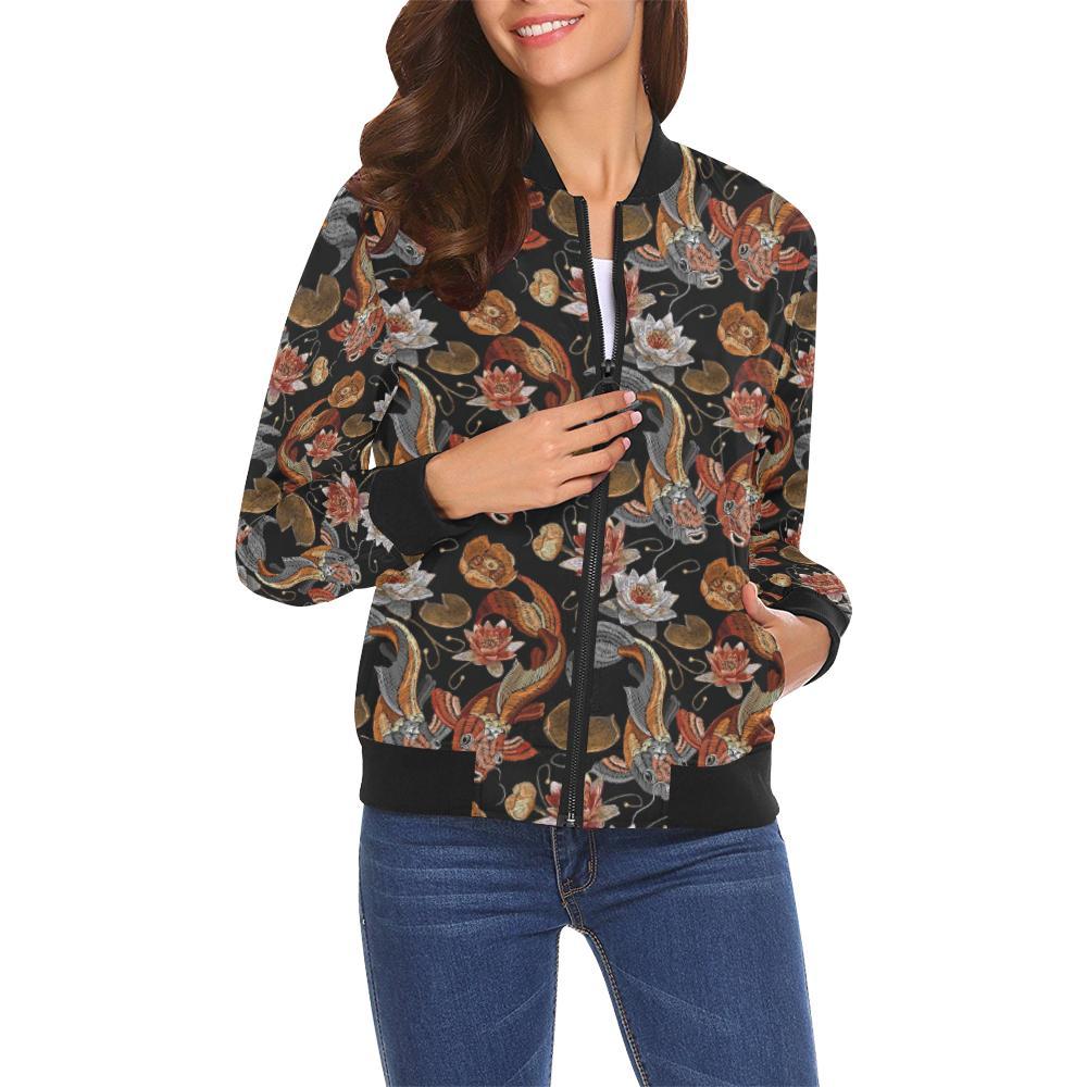 Koi Fish Crochet Lotus Pattern Print Women Casual Bomber Jacket