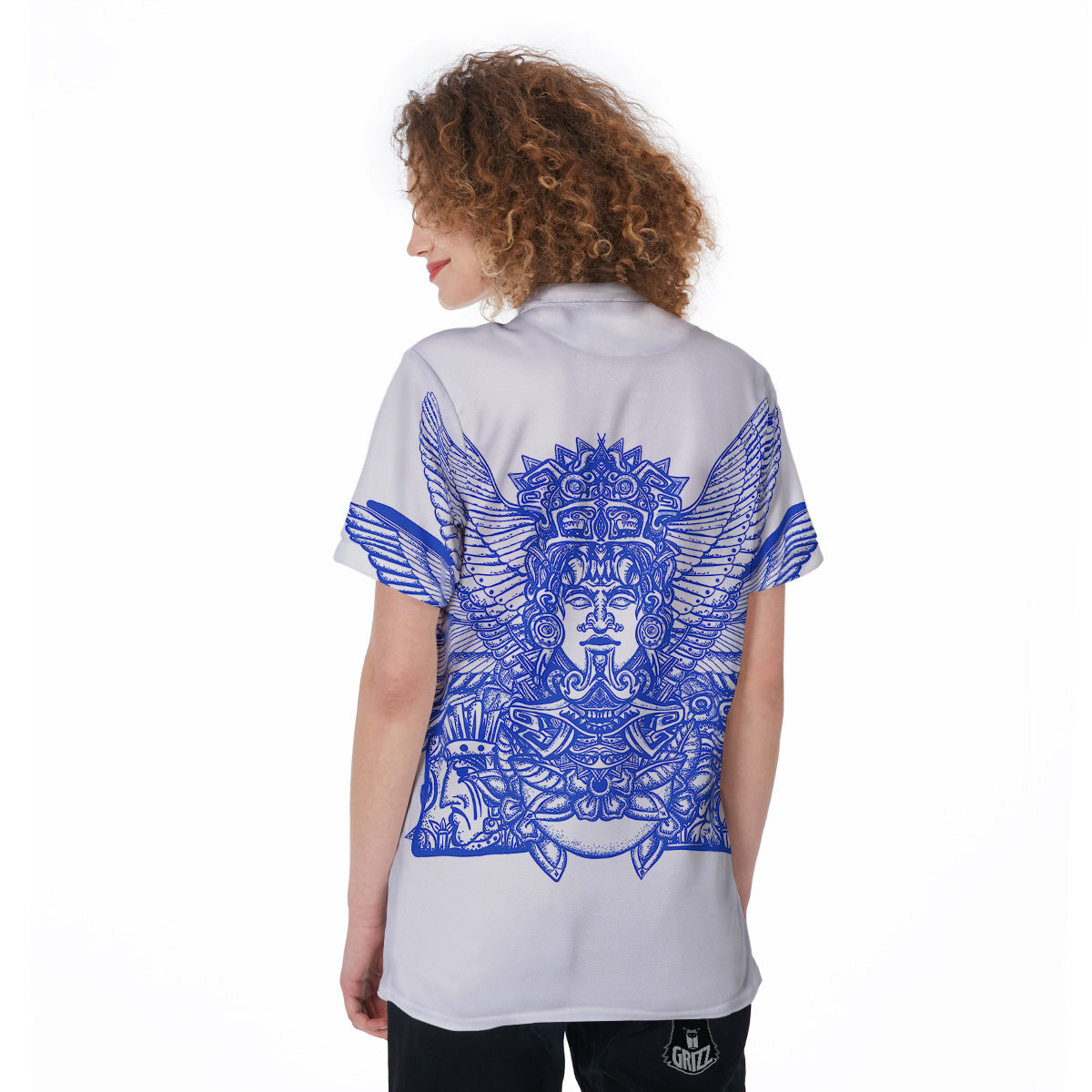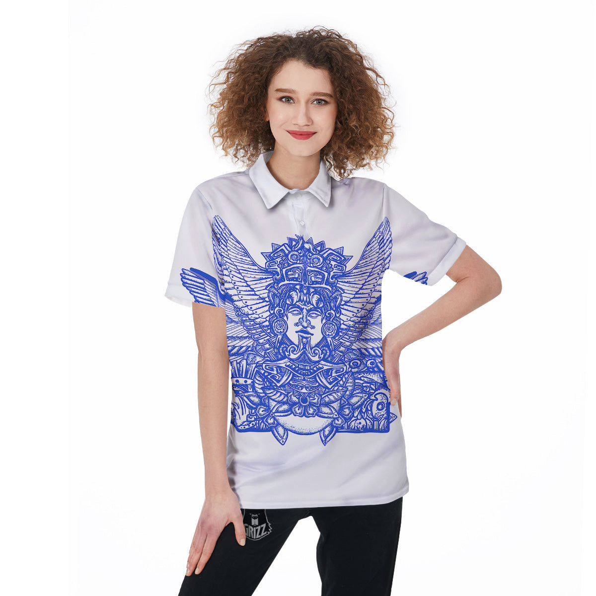 Mayan Statue White And Blue Print Women's Golf Shirts