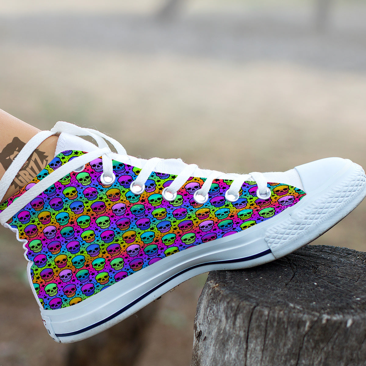 Neon Bright Human Skulls Print Pattern White High Top Shoes