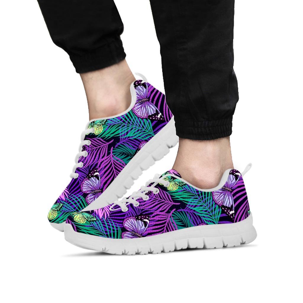 Neon Purple Tropical Palm Tree Butterfly Print Men's Sneakers