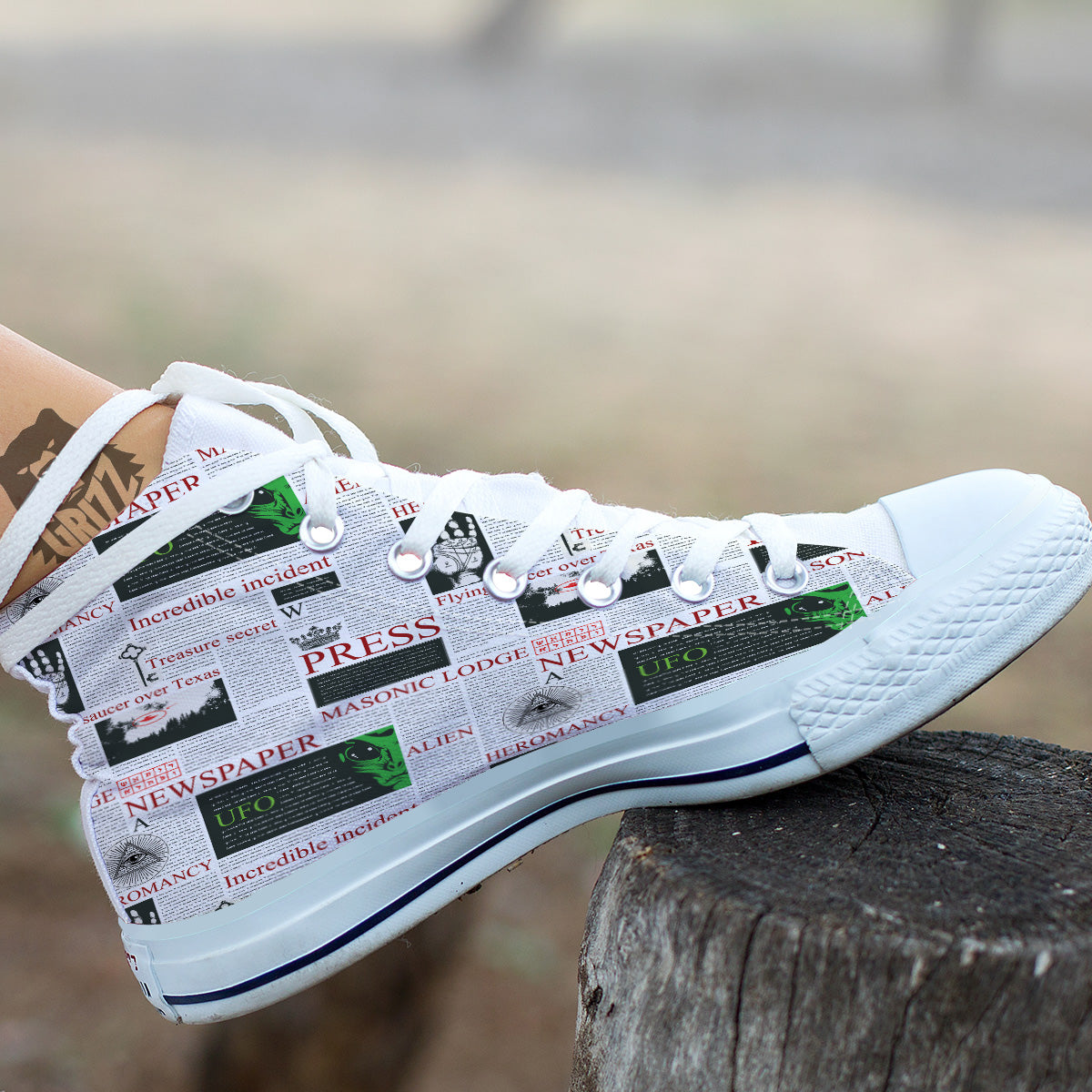 Looking for a unique shoes? Check out our Newspaper Aliens Topic Print Pattern White High Top Shoes at Grizzshopping. Our shoes are handcrafted to the highest quality standards that custom made for you
