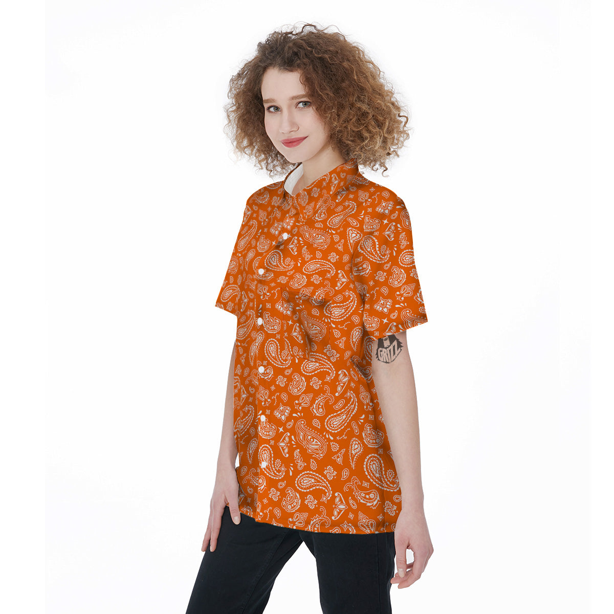 Orange Paisley Bandana Print Women's Short Sleeve Shirts