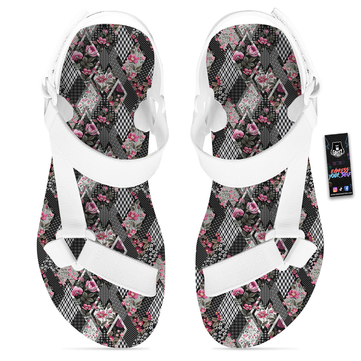 Looking for unique toe sandals? Check out our Patchwork Floral Black Pink Print Pattern White Open Toe Sandals at Grizzshopping. Our toe sandals are handcrafted to the highest quality standards that custom made for you
