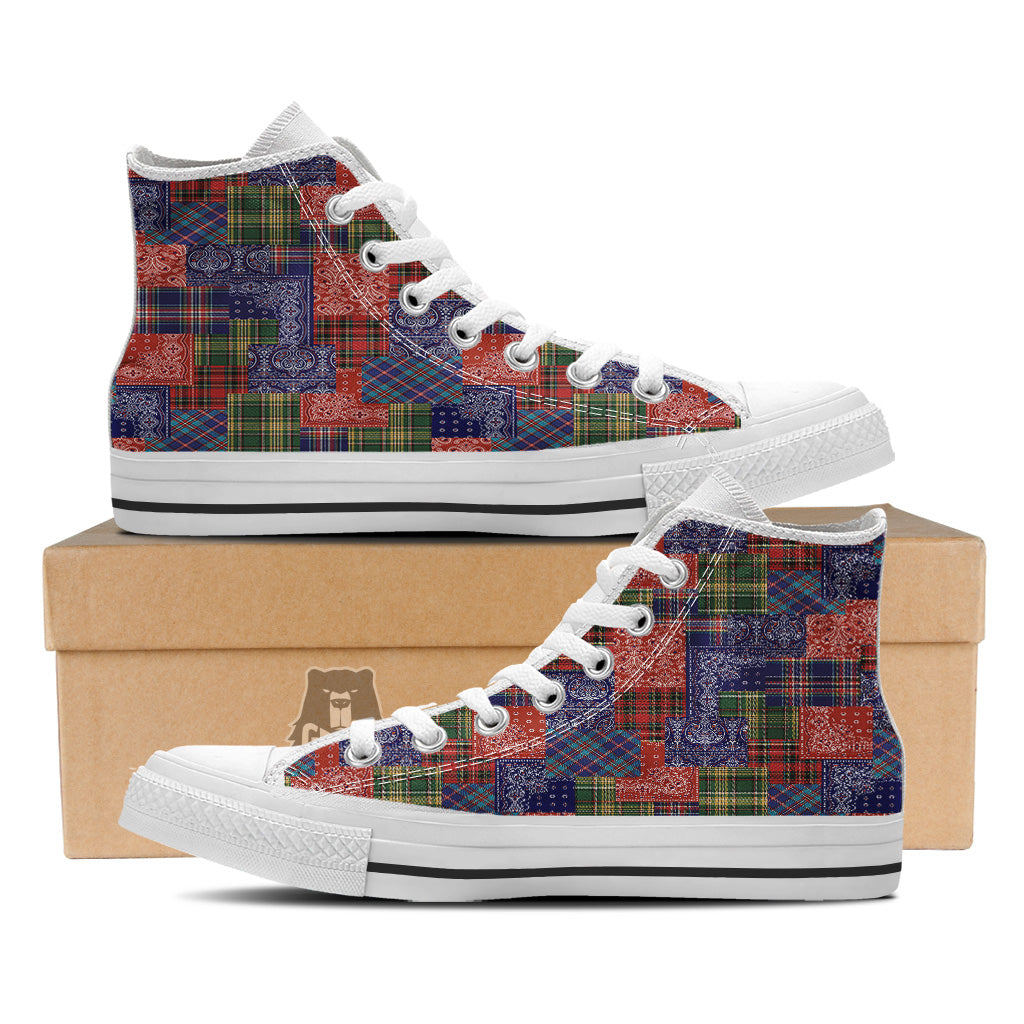 Patchwork Tartan And Bandana Print Pattern White High Top Shoes