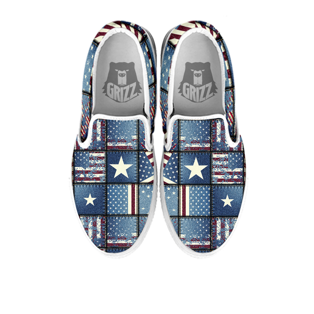 Looking for a unique Slip On Sneakers? Check out our Patchwork USA Denim Print Pattern White Slip On Shoes at Grizzshopping. Our Slip On Sneakers are handcrafted to the highest quality standards that custom made for you