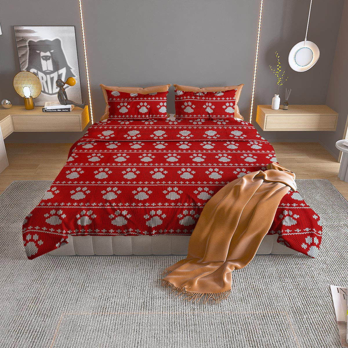 Paw Knitted White And Red Print Pattern Duvet Cover Bedding Set