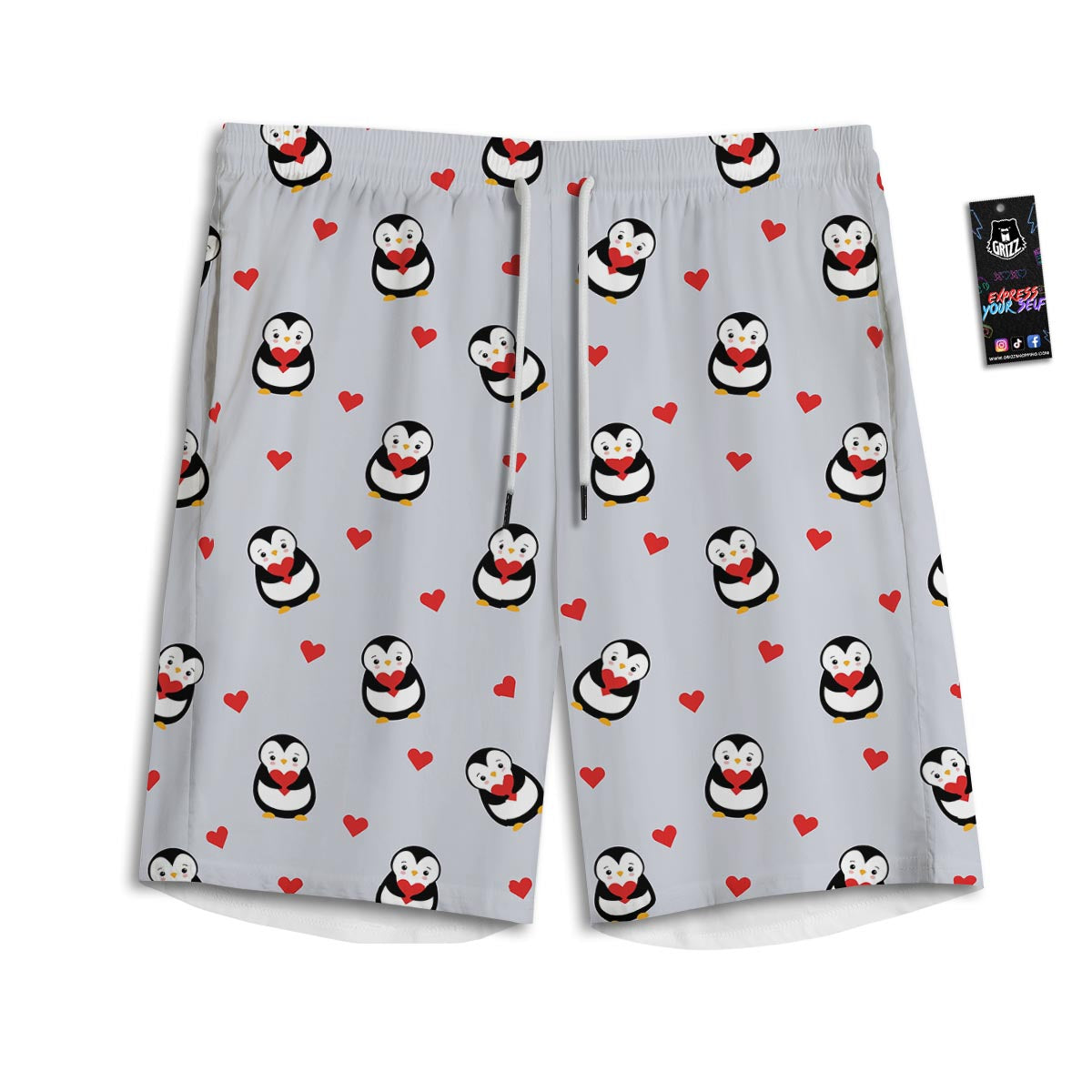 Penguin And Red Heart Print Pattern Men's Athletic Shorts