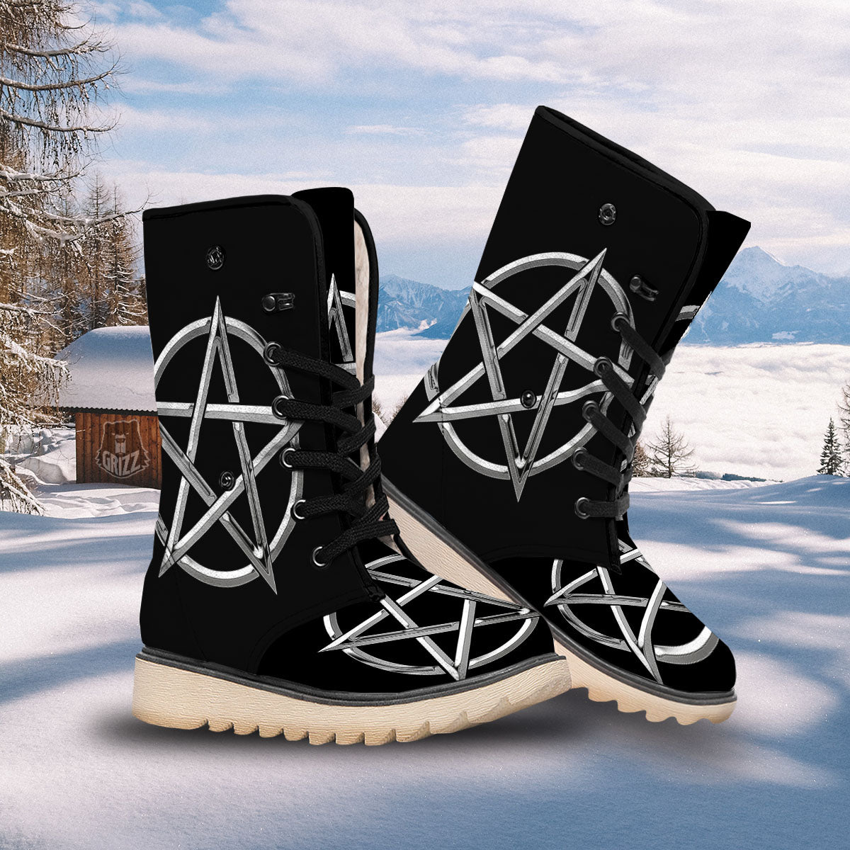Looking for unique snow boots? Check out our Pentagram Symbol White And Black Print Snow Boots at Grizzshopping. Our snow boots are handcrafted to the highest quality standards that custom made for you