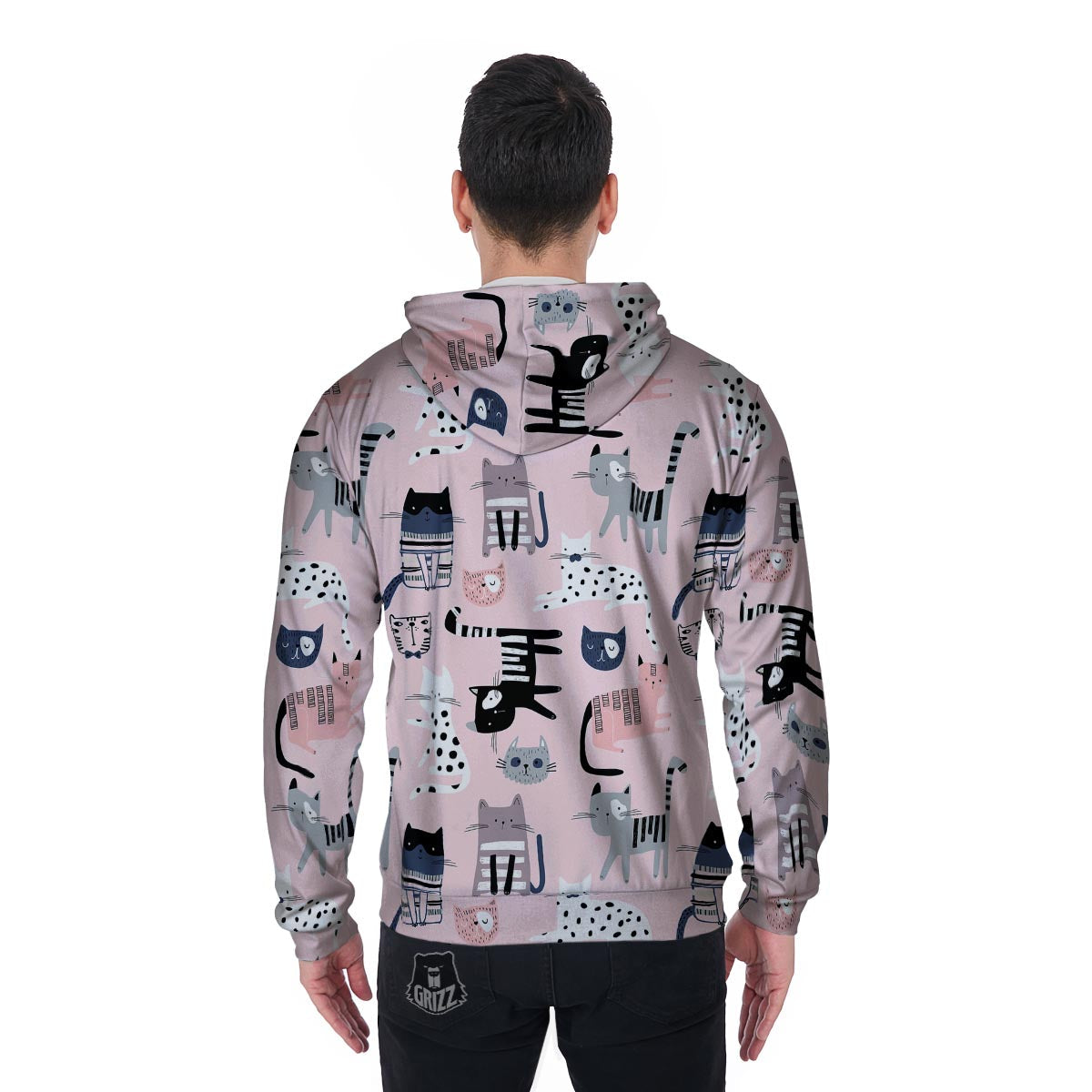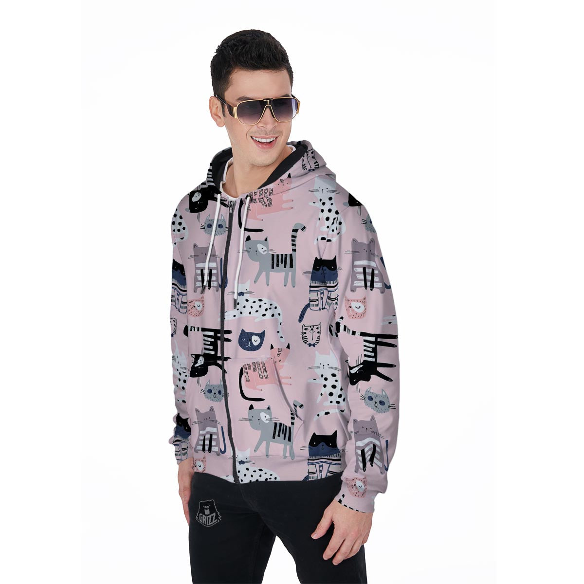 Pink Cute Cat Print Men's Zip Up Hoodie