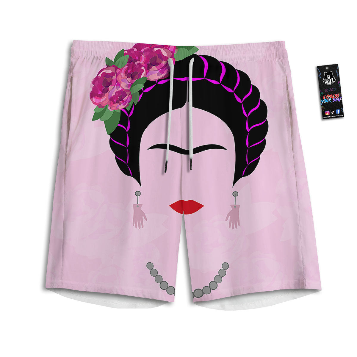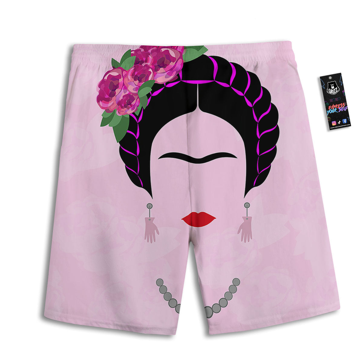 Pink Flower And Frida Kahlo Print Men's Athletic Shorts
