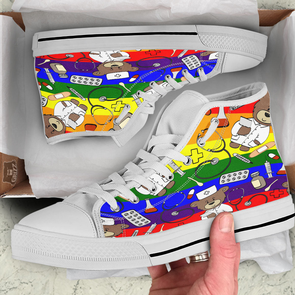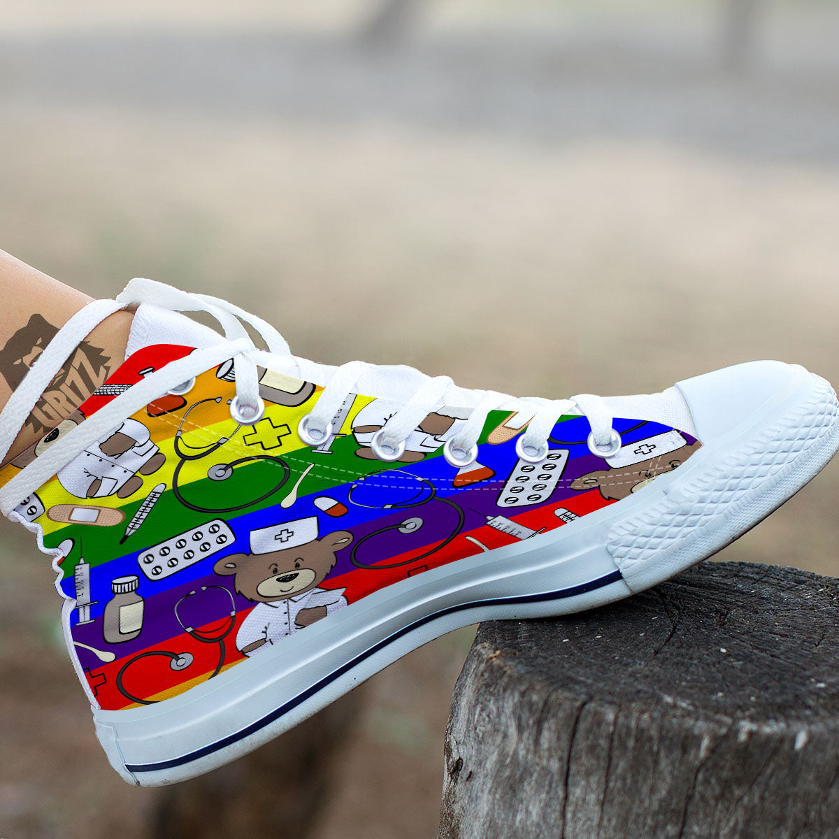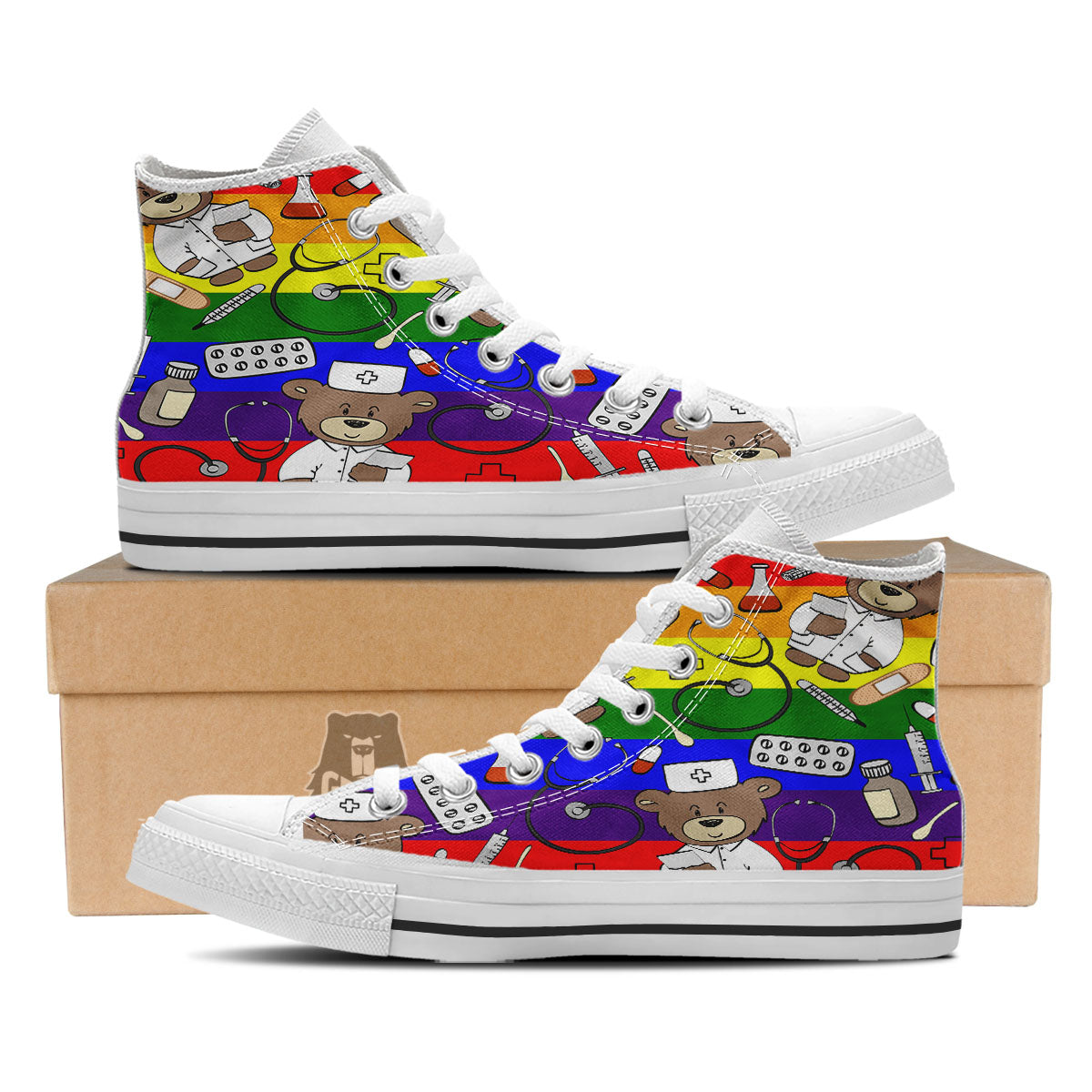 Rainbow Color LGBT Teddy Bear Nurse White High Top Shoes