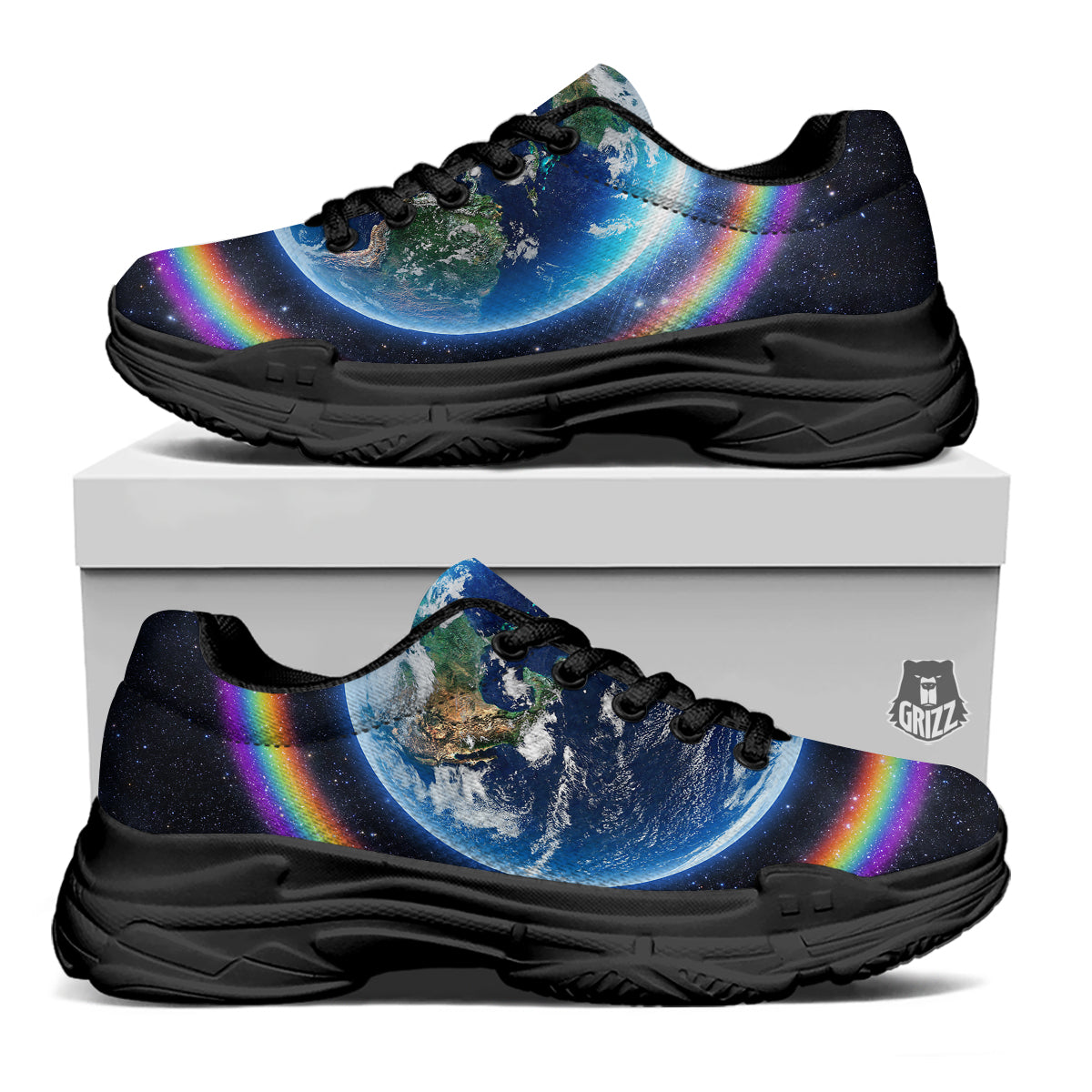 Looking for unique chunky shoes? Check out our Rainbow The Earth Print Black Chunky Shoes at Grizzshopping. Our chunky shoes are handcrafted to the highest quality standards that custom made for you
