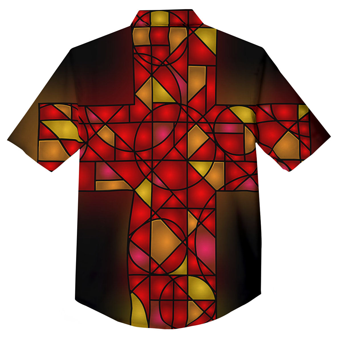 Red And Orange Cross Stained Glass Print Button Up Shirt