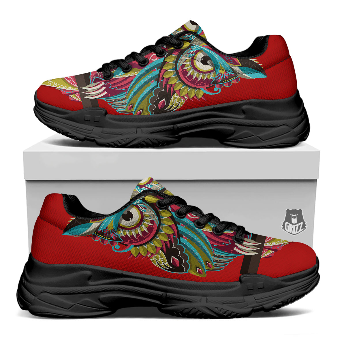Looking for unique chunky shoes? Check out our Red Colorful Owl Print Black Chunky Shoes at Grizzshopping. Our chunky shoes are handcrafted to the highest quality standards that custom made for you