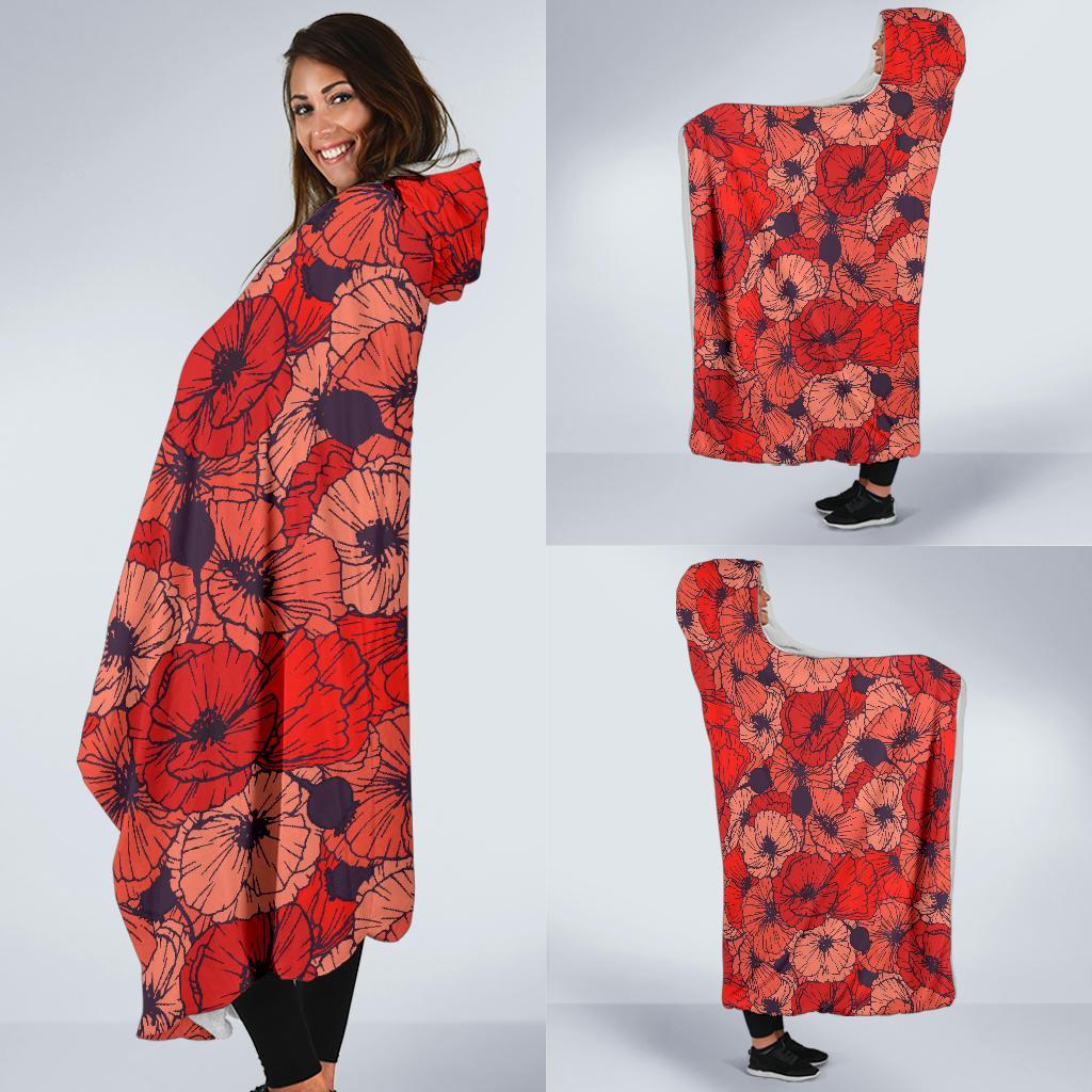 Red Poppy Floral Pattern Print Hooded Blanket