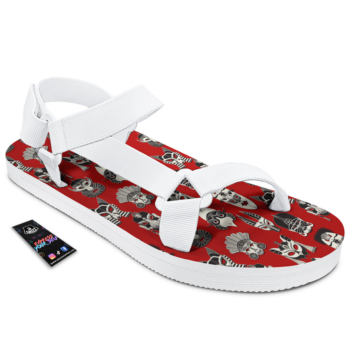 Red White Tribal Mask Print Pattern White Open Toe Sandals