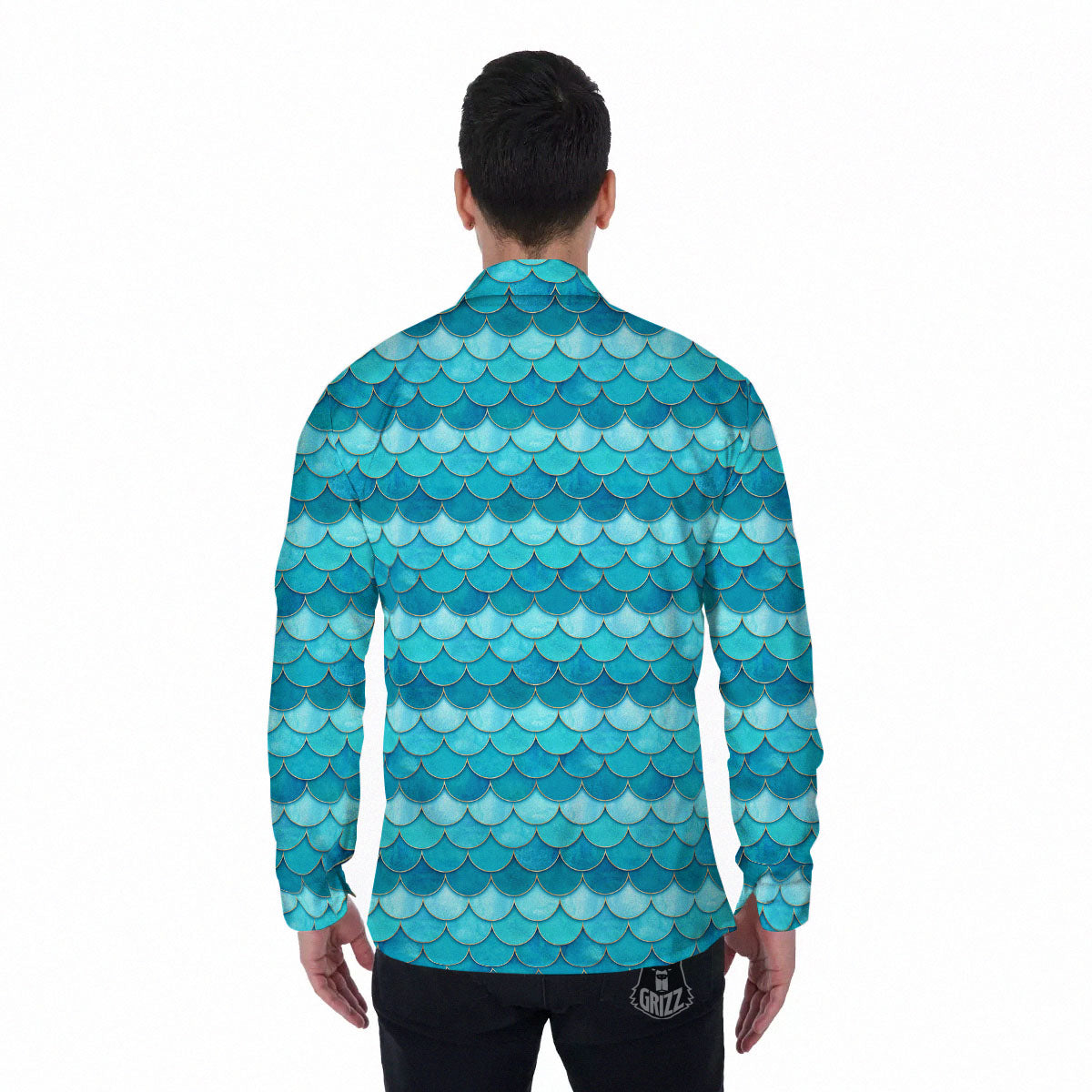 Scales Mermaid Blue Print Pattern Men's Long Sleeve Shirts