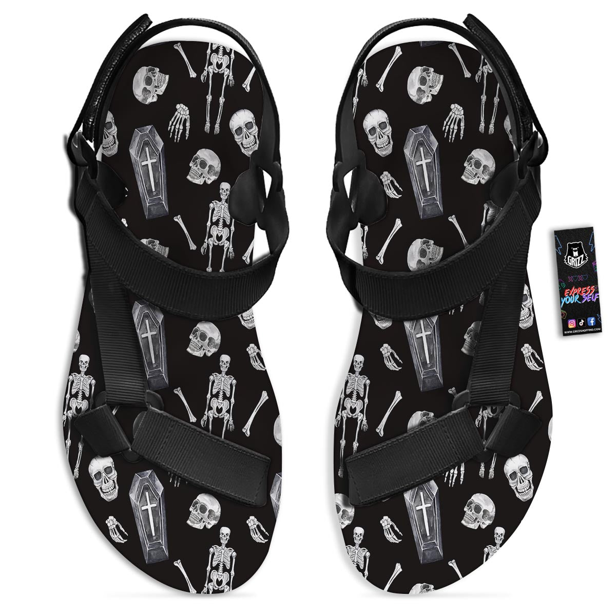 Skeleton And Tomb Print Pattern Black Open Toe Sandals