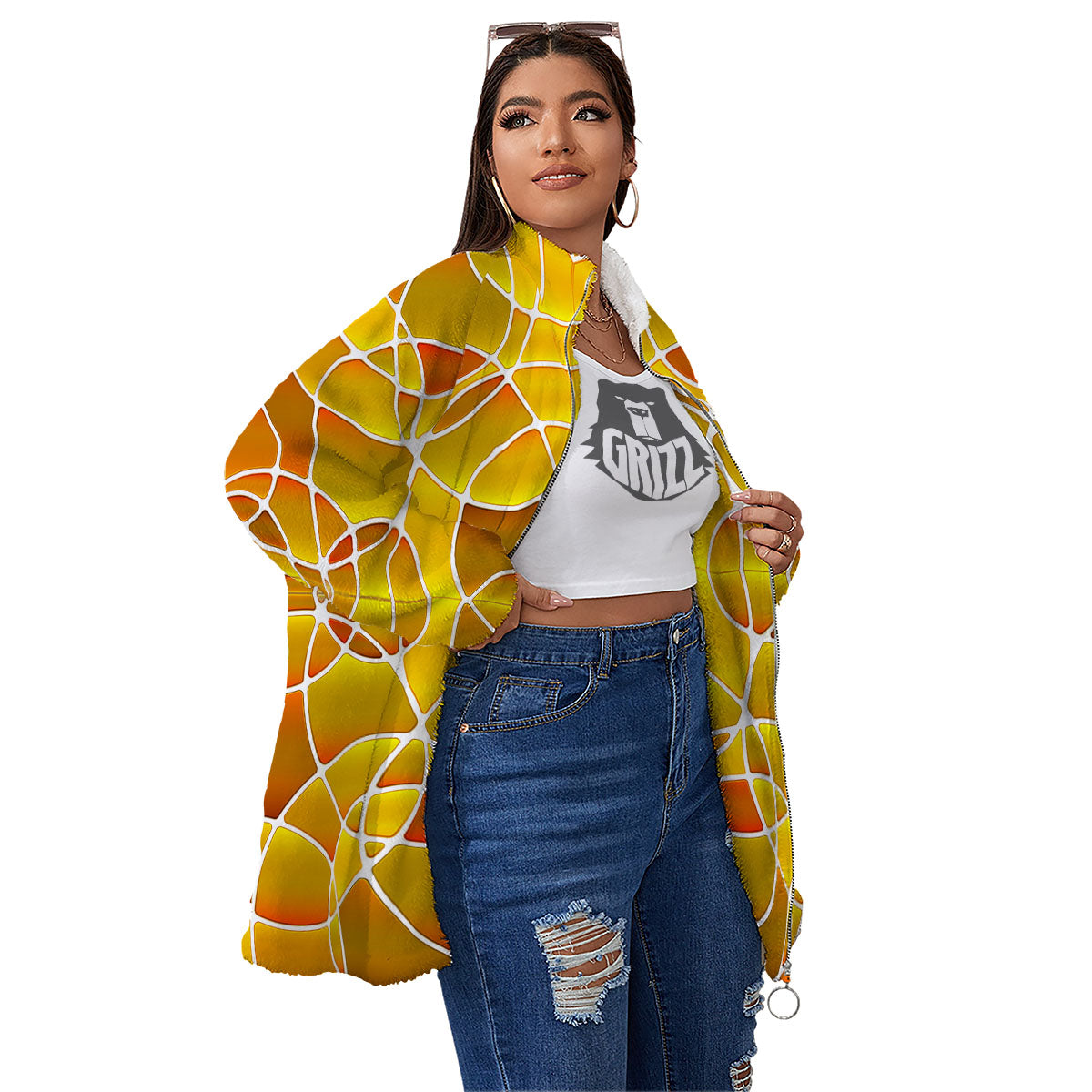 Looking for a unique Jacket? Check out our Stained Glass Mosaic Yellow Print Pattern Women's Sherpa Jacket at Grizzshopping. Our jacket are handcrafted to the highest quality standards that custom made for you