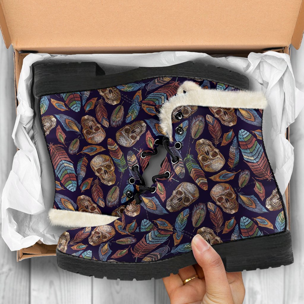 Sugar Skull Skeleton Girly Feather Boho Pattern Print Comfy Winter Boots