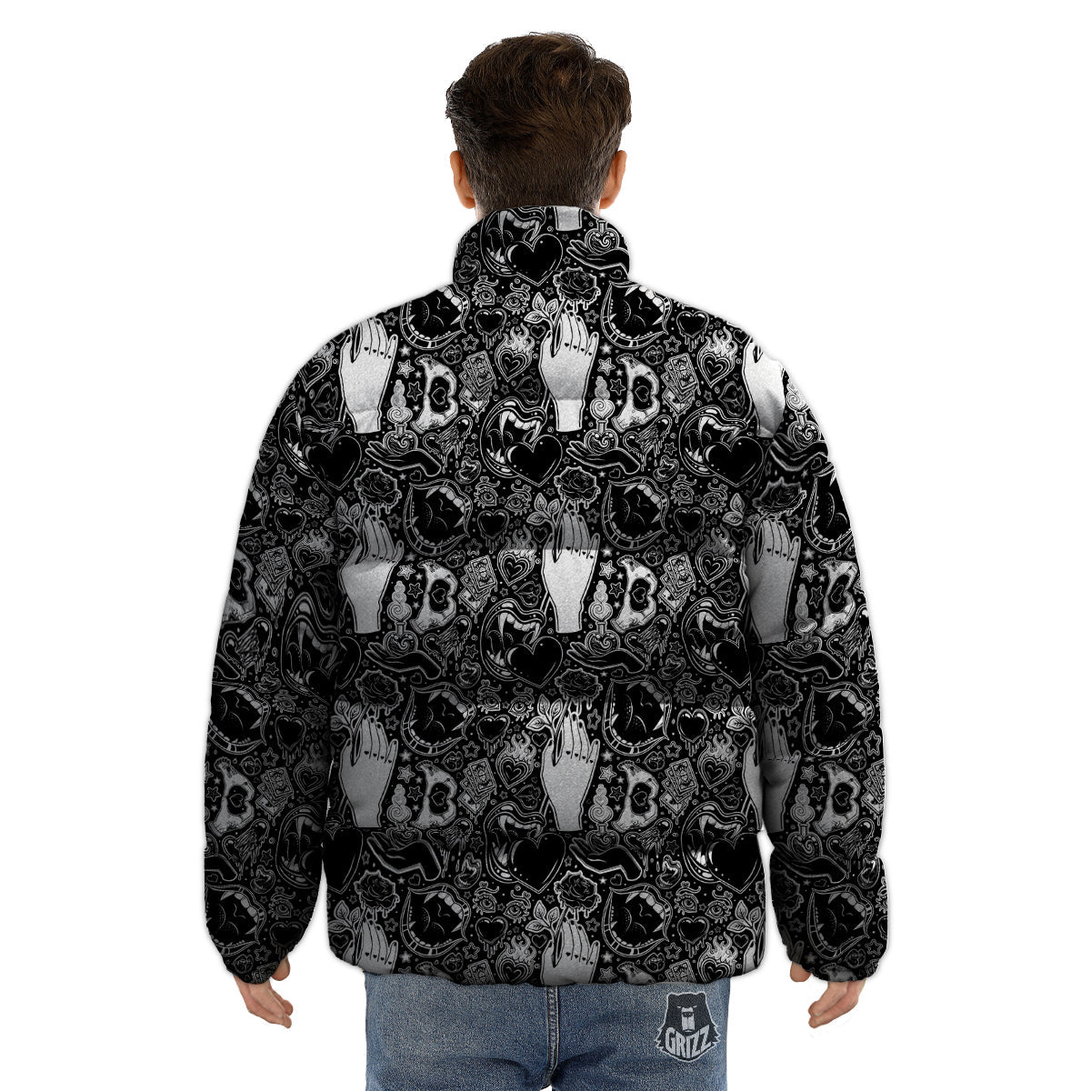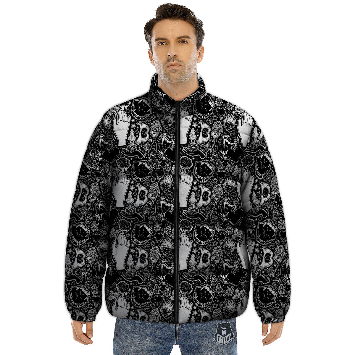 Tattoo Vampire Black and White Print Pattern Puffer Jacket