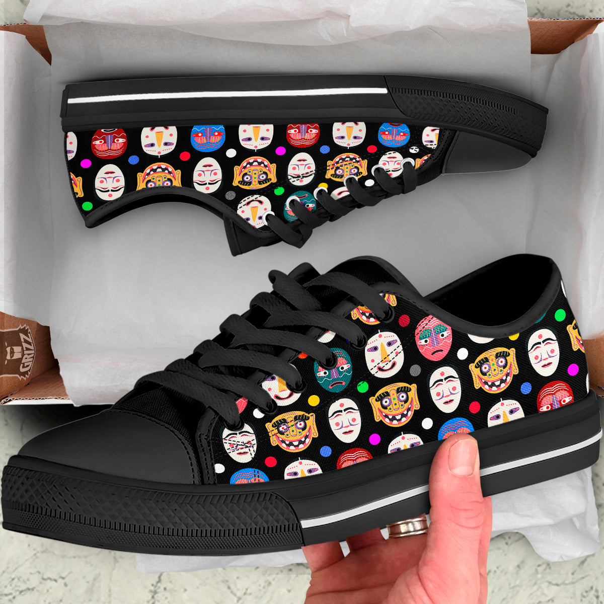 Looking for a unique low top shoes? Check out our Traditional Korean Masks Print Pattern Black Low Top Shoes at Grizzshopping. Our low top shoes are handcrafted to the highest quality standards that custom made for you