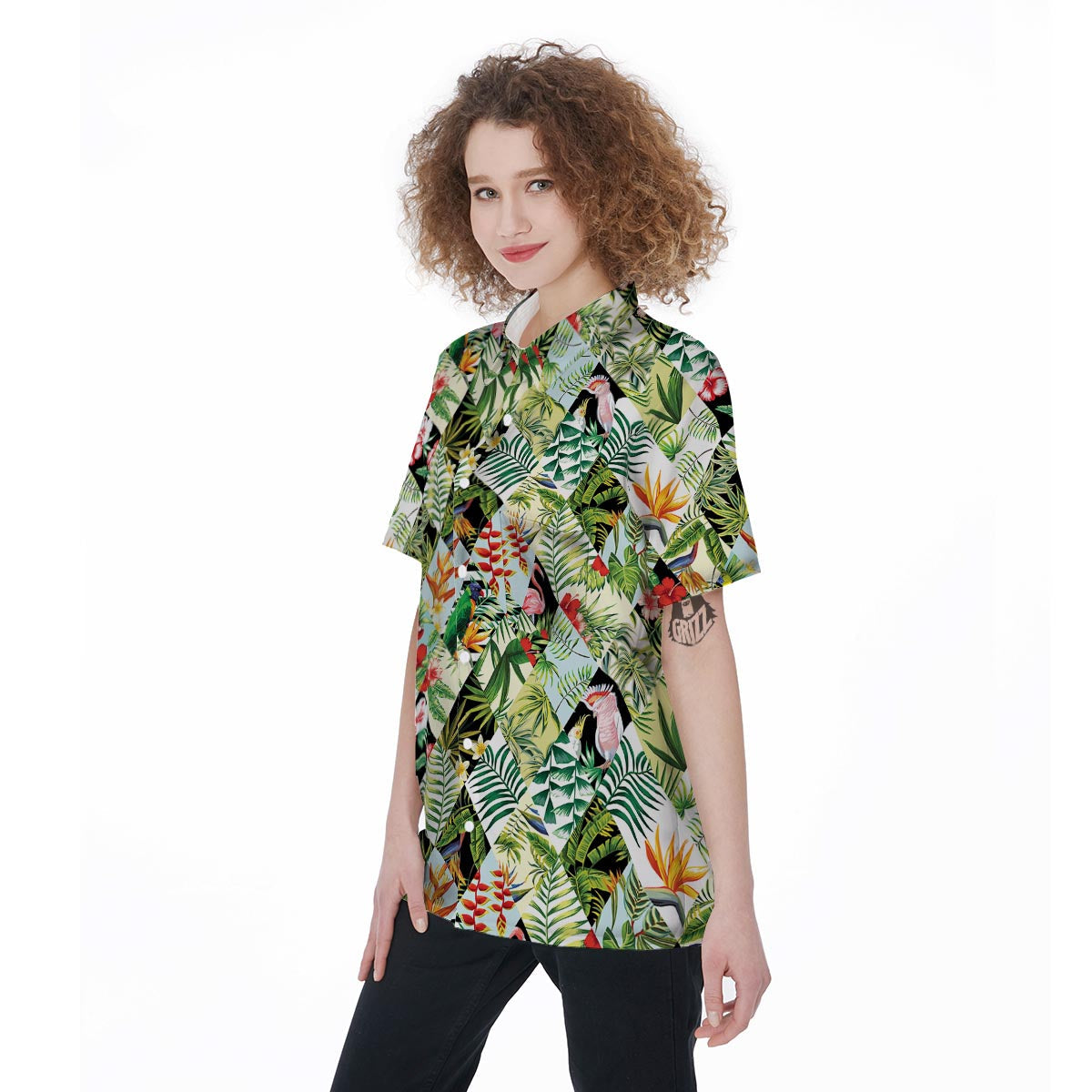 Tropical Bird Patchwork Print Women's Short Sleeve Shirts