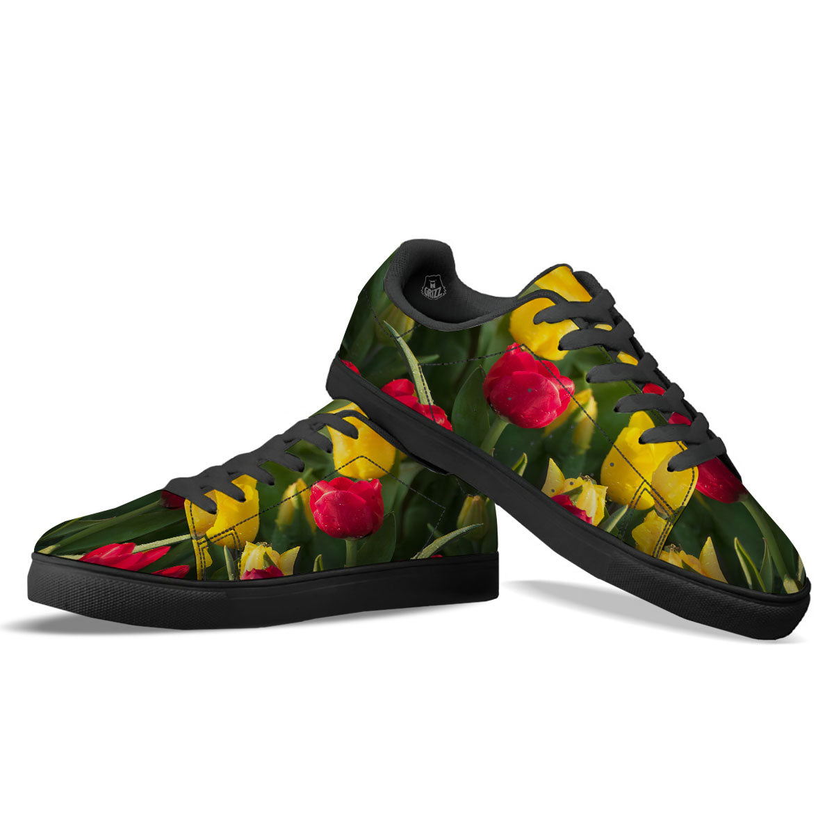 Tulip Yellow And Red Print Black Low Top Sneakers