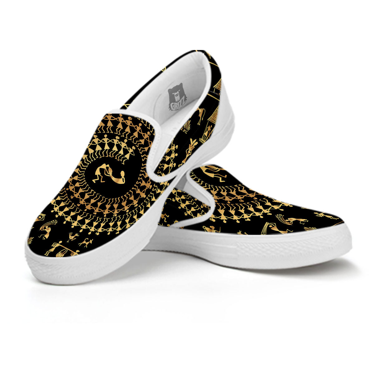 Looking for a unique Slip On Sneakers? Check out our Warli Tribal Gold And Black Print White Slip On Shoes at Grizzshopping. Our Slip On Sneakers are handcrafted to the highest quality standards that custom made for you