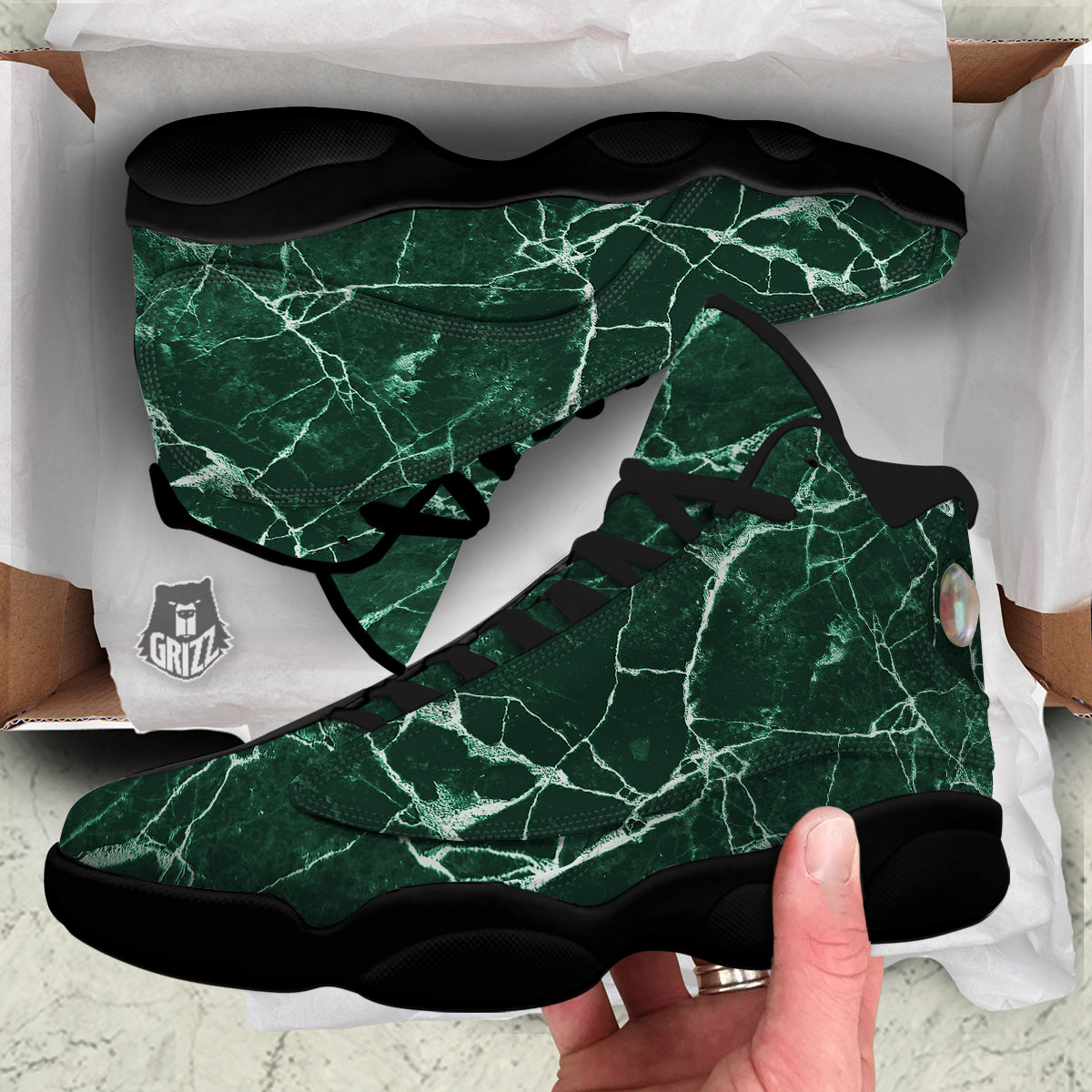 White And Dark Green Marble Texture Print Black Basketball Shoes