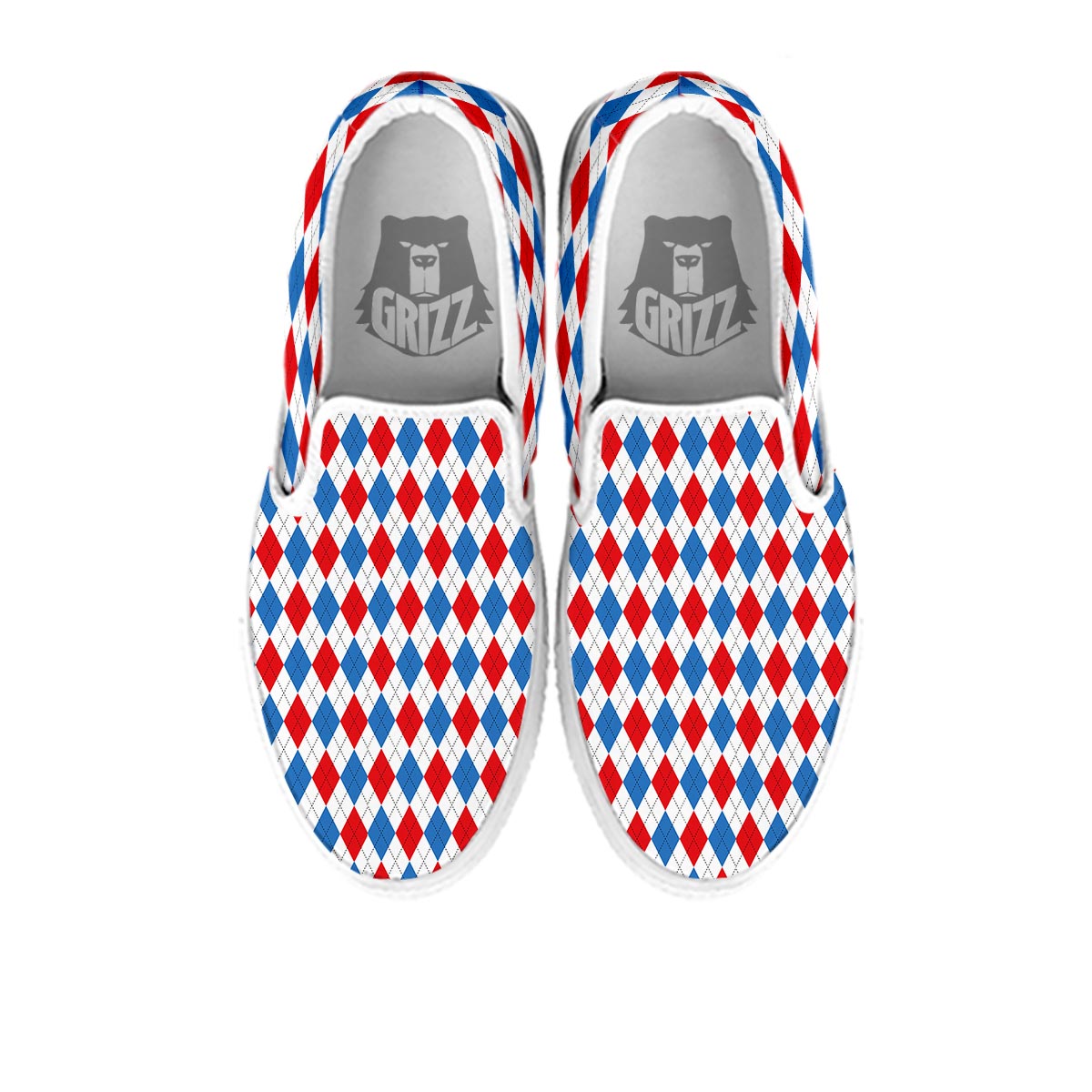 Looking for a unique Slip On Sneakers? Check out our White Argyle And Blue Red Print Pattern White Slip On Shoes at Grizzshopping. Our Slip On Sneakers are handcrafted to the highest quality standards that custom made for you