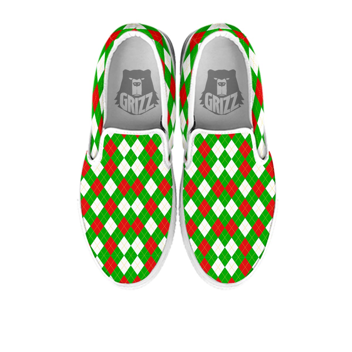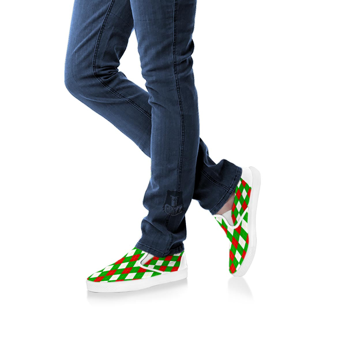 White Argyle And Green Red Print Pattern White Slip On Shoes