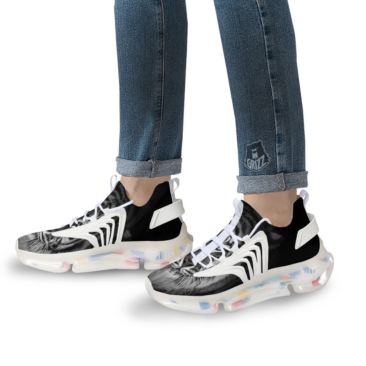 White Bengal Tiger Monochrome Print White Gym Shoes