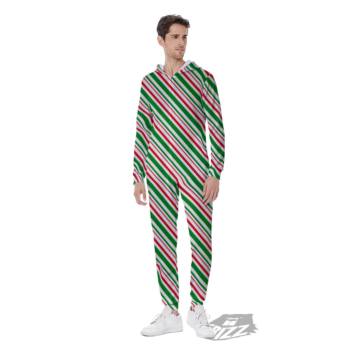 White Candy Cane And Red Green Print Men's Jumpsuit