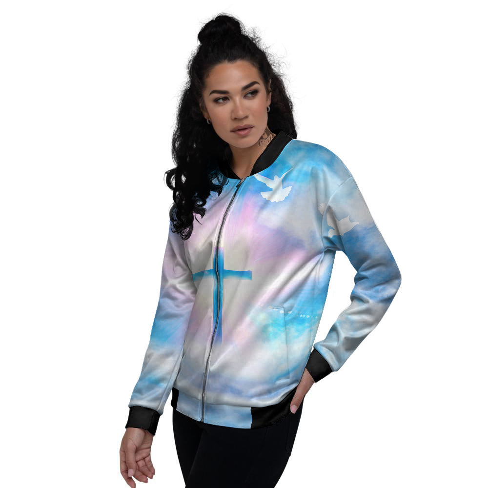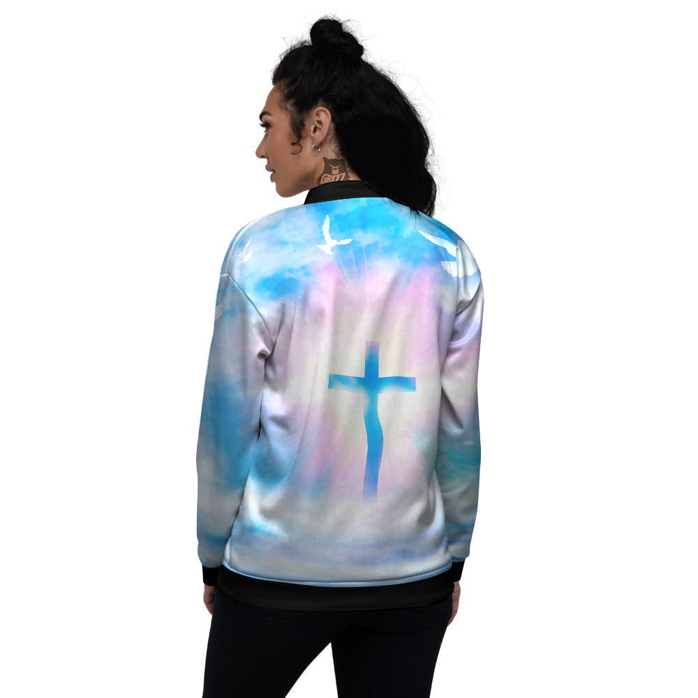 White Doves And Christian Cross Print Women's Bomber Jacket