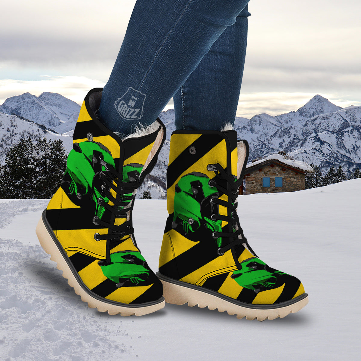 Looking for unique snow boots? Check out our Yellow And Green Helmet Print Snow Boots at Grizzshopping. Our snow boots are handcrafted to the highest quality standards that custom made for you