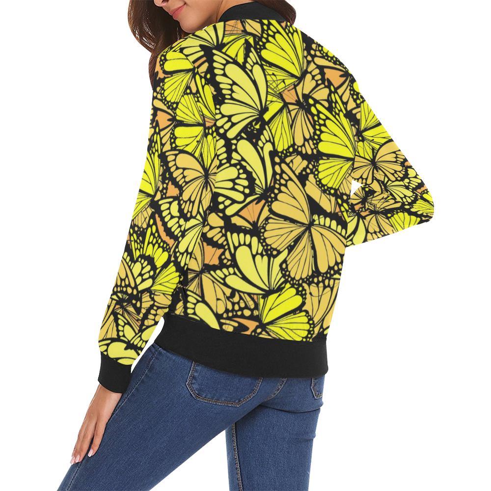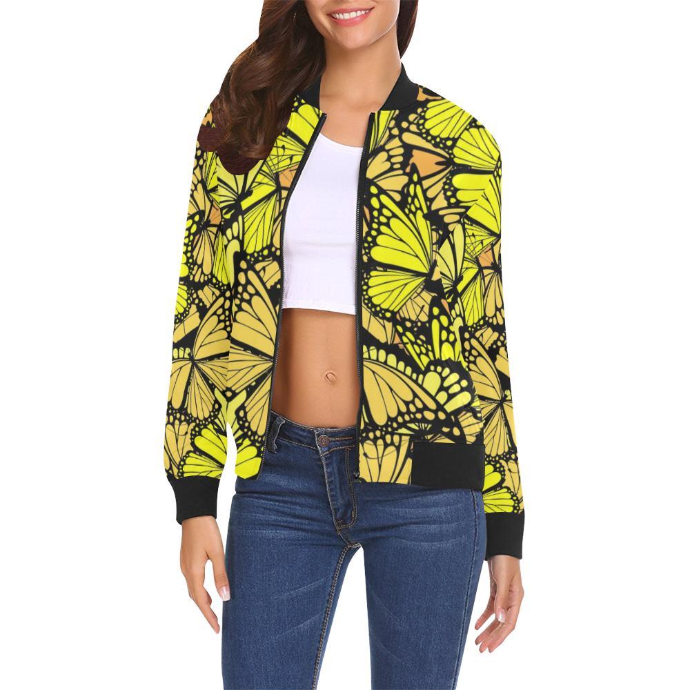 Yellow Monarch Butterfly Pattern Print Women Casual Bomber Jacket
